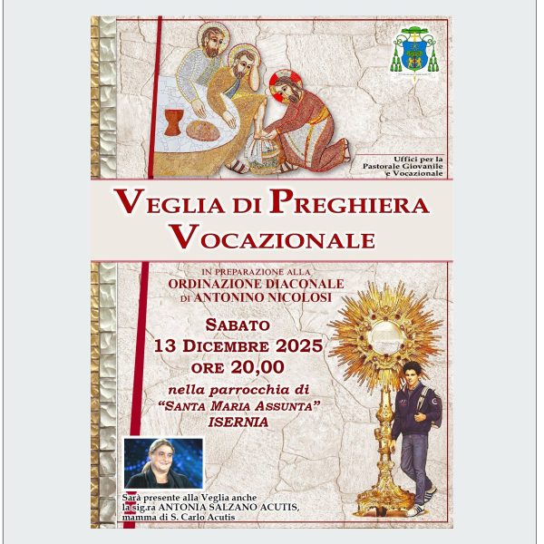 Sabato 13 dicembre alle ore 20,00 nella parrocchia di S. Maria Assunta ad Isernia – In preparazione all’Ordinazione Diaconale di Antonino Nicolosi, gli Uffici diocesani… Leggi