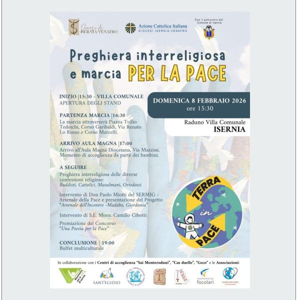 DOMENICA 8 FEBBRAIO 2026 ore 15:30 Raduno Villa Comunale ISERNIA – Preghiera interreligiosa e marcia PER LA PACE – APERTURA DEGLI STAND – PARTENZA MARCIA 16:30… Leggi