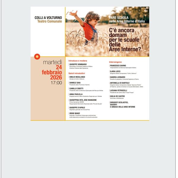 Martedì 24 febbraio 2026 ore 17:00 – COLLI A VOLTURNO Teatro Comunale – FARE SCUOLA nelle Aree Interne d’Italia C’è ancora domani per le scuole… Leggi