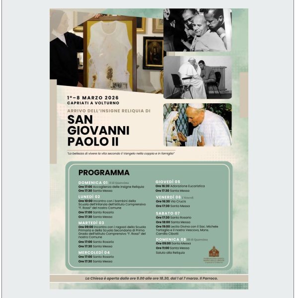 Dal 1° all’8 MARZO 2026 CAPRIATI A VOLTURNO ARRIVO DELL’INSIGNE RELIQUIA DI SAN GIOVANNI PAOLO II – “La bellezza di vivere la vita secondo il… Leggi