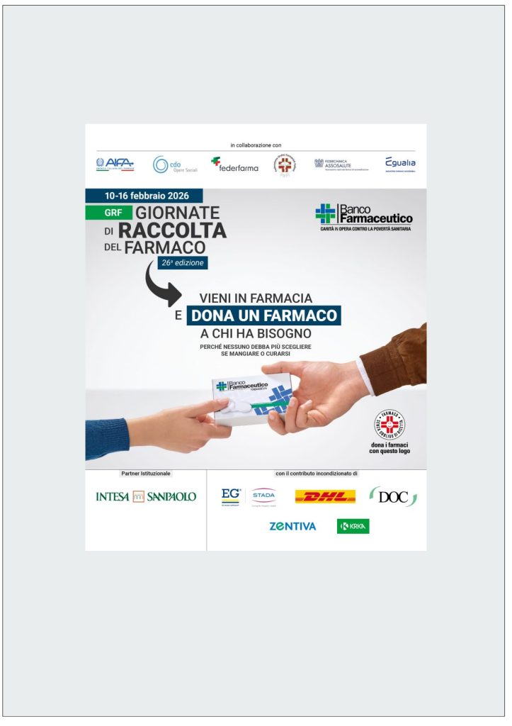 Sabato 14 febbraio 2026 i nostri volontari saranno presenti alla Farmacia dei Pentri di Isernia ed alle Farmacie Del Corso, Santa Daria e Sardella di Venafro ed inviteranno gli utenti ad acquistare e donare farmaci da banco. Iniziativa che rientra nella 26^ edizione della Giornata di Raccolta del Farmaco che si terrà dal 10 al 16 febbraio 2026.
