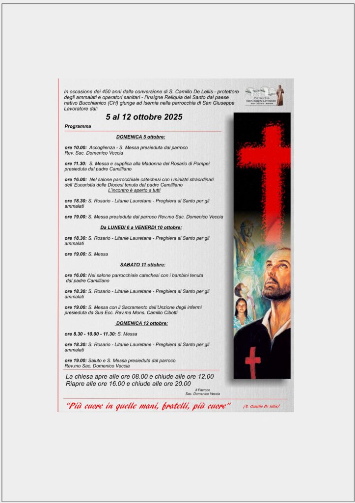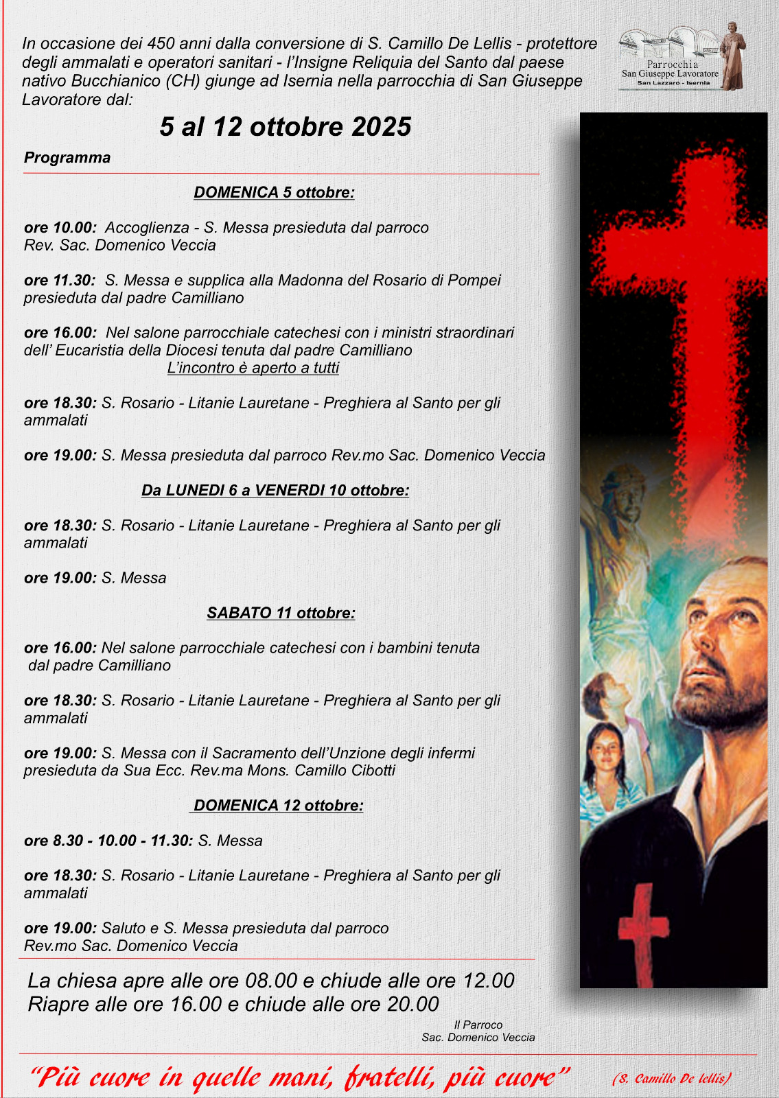 Dal 5 al 12 ottobre 2015 – in occasione dei 450 anni dalla conversione di San Camillo De Lellis protettore degli ammalati e degli operatori sanitari l’Insigne Reliquia del Santo dal paese nativo Bucchianico (CH) giunge ad Isernia nella Parrocchia di San Giuseppe Lavoratore –
