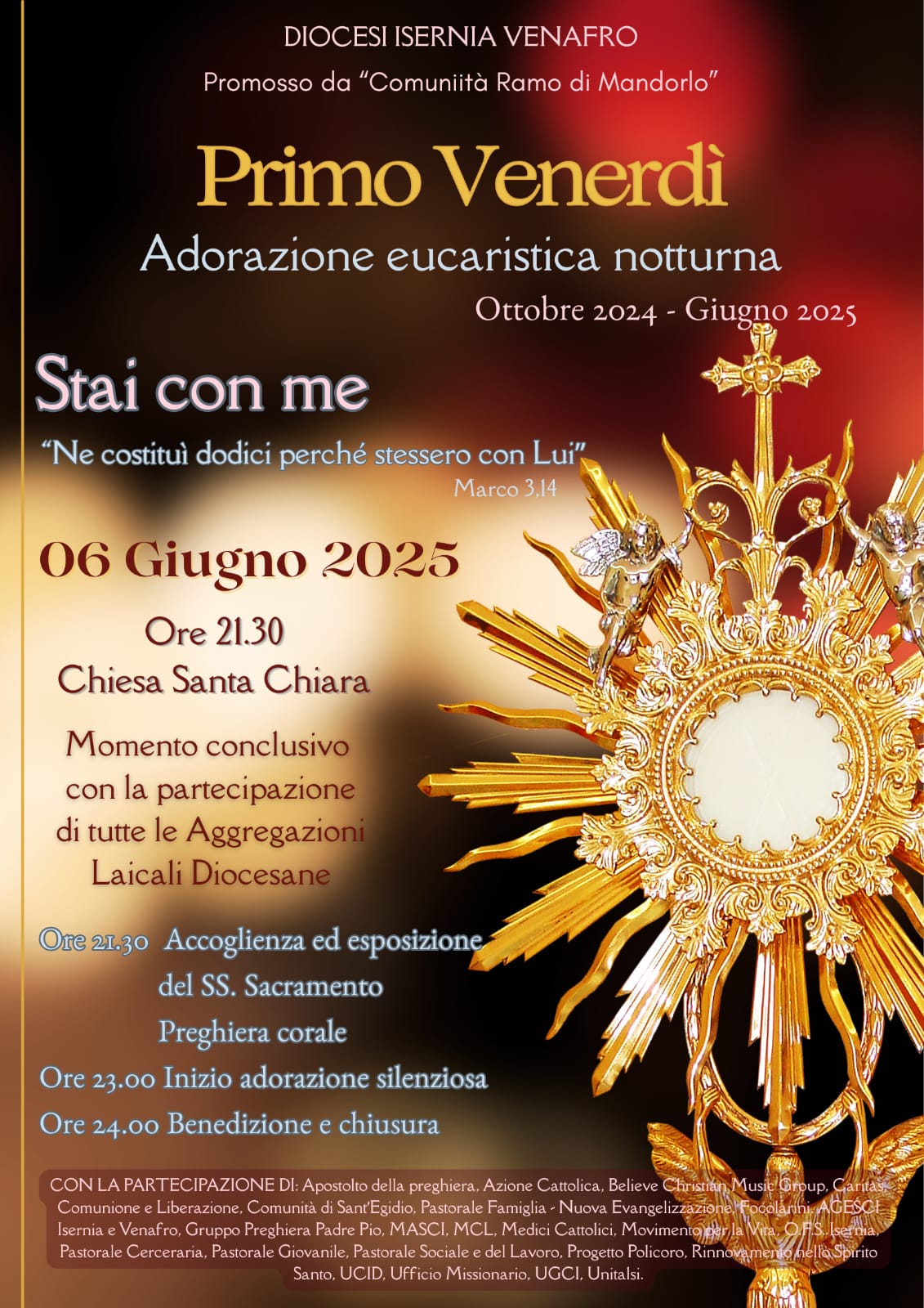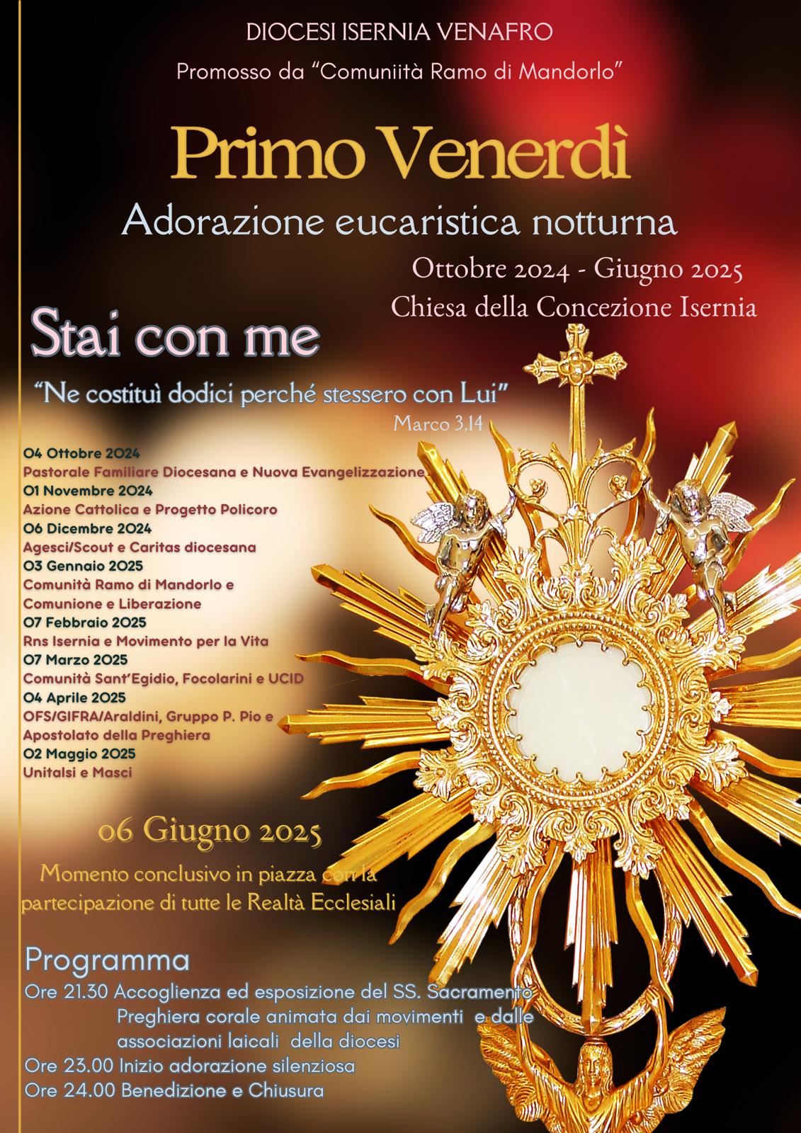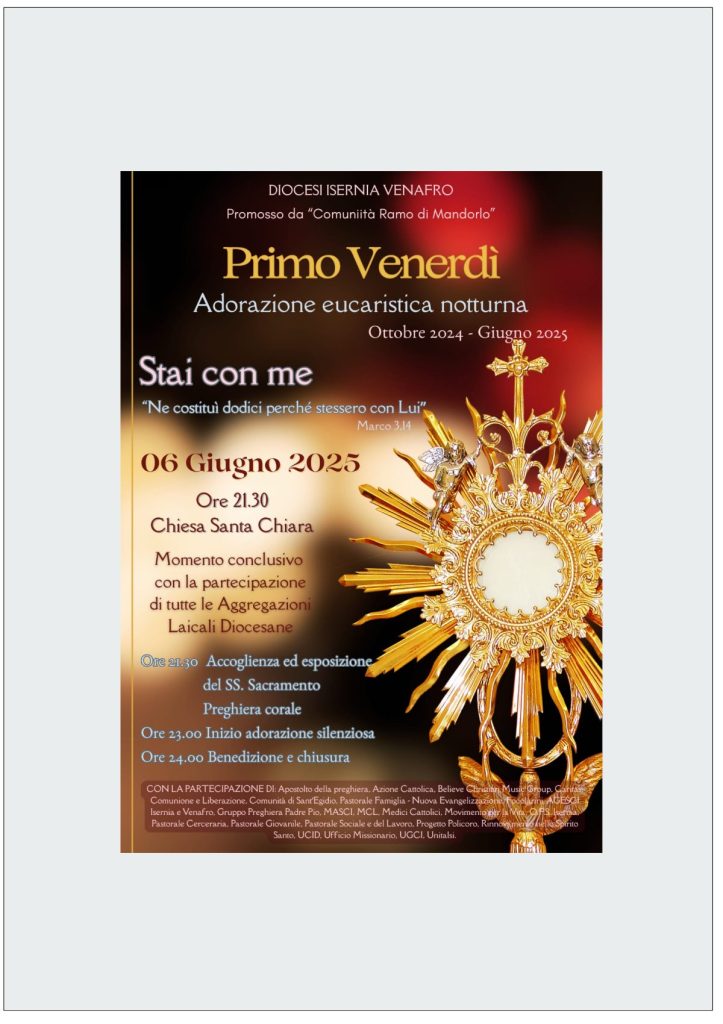Al termine di un intero anno di Adorazione vissuto ogni “Primo Venerdì” del mese (su iniziativa della Comunità “Ramo di Mandorlo” di Isernia) tutte le Aggregazioni Laicali della nostra Diocesi di Isernia-Venafro si ritroveranno, presso la Chiesa Santa Chiara di Isernia, per vivere una manifestazione religiosa che si terrà: