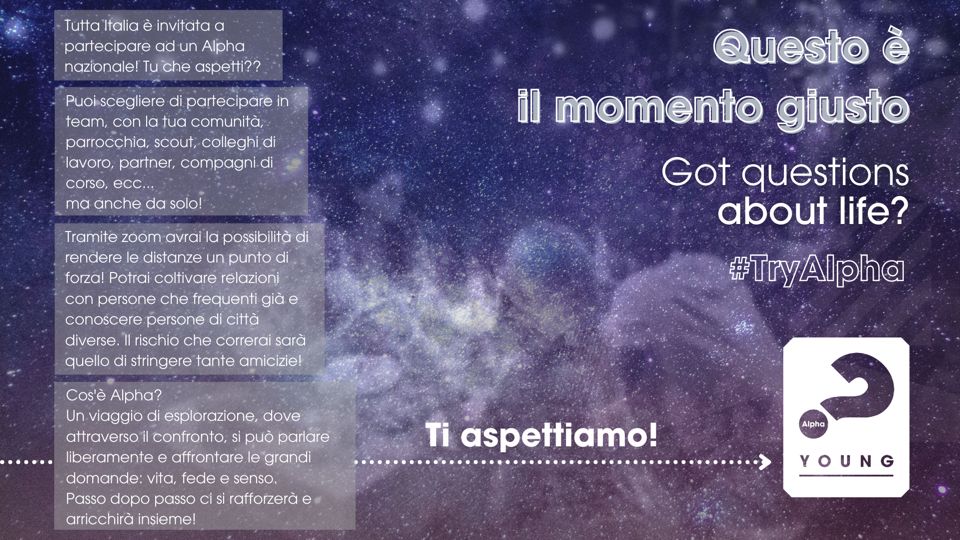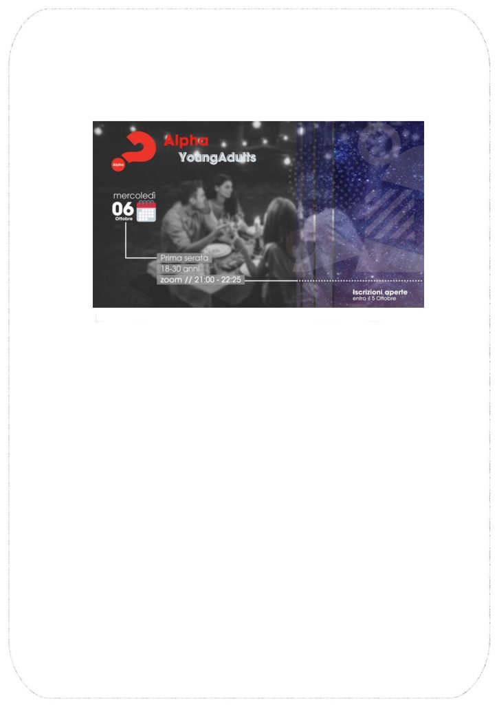 Mercoledì 6 ottobre, alle 21,00 – parte di nuovo Alpha Young, per giovani da 18 a 30 anni, nella versione online, che quest’anno sarà animato anche da una coppia di fidanzati della nostra diocesi, Jessika e Pierluca, entrati da poco a far parte del team giovani di Alpha Italia.