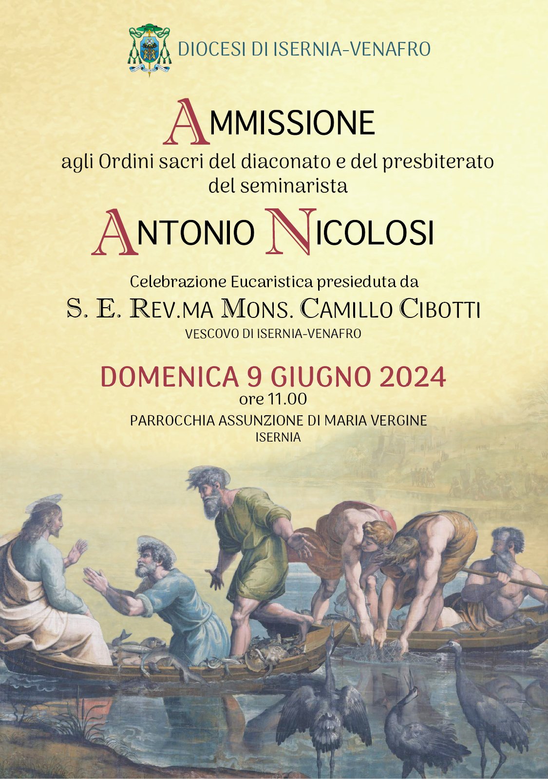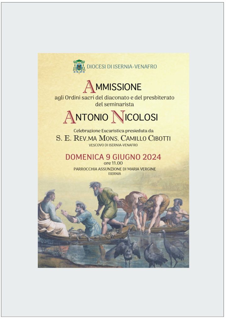 Archivio news in primo piano Ammissione agli Ordini Sacri del seminarista Antonio Nicolosi Domenica 9 giugno 2024 ore 11.00 – Parrocchia Assunzione di Maria Vergine ad Isernia – FacebookTwitterLinkedin