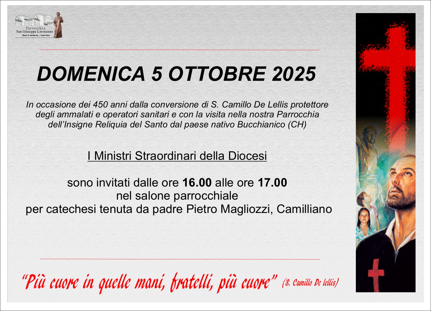 Domenica 5 ottobre 2025 dalle 16.00 alle 17.00 presso la Parrocchia di San Giuseppe Lavoratore ad Isernia Padre Pietro Magliozzi, Camilliano, terrà una catechesi per i Ministri Straordinari della Diocesi
