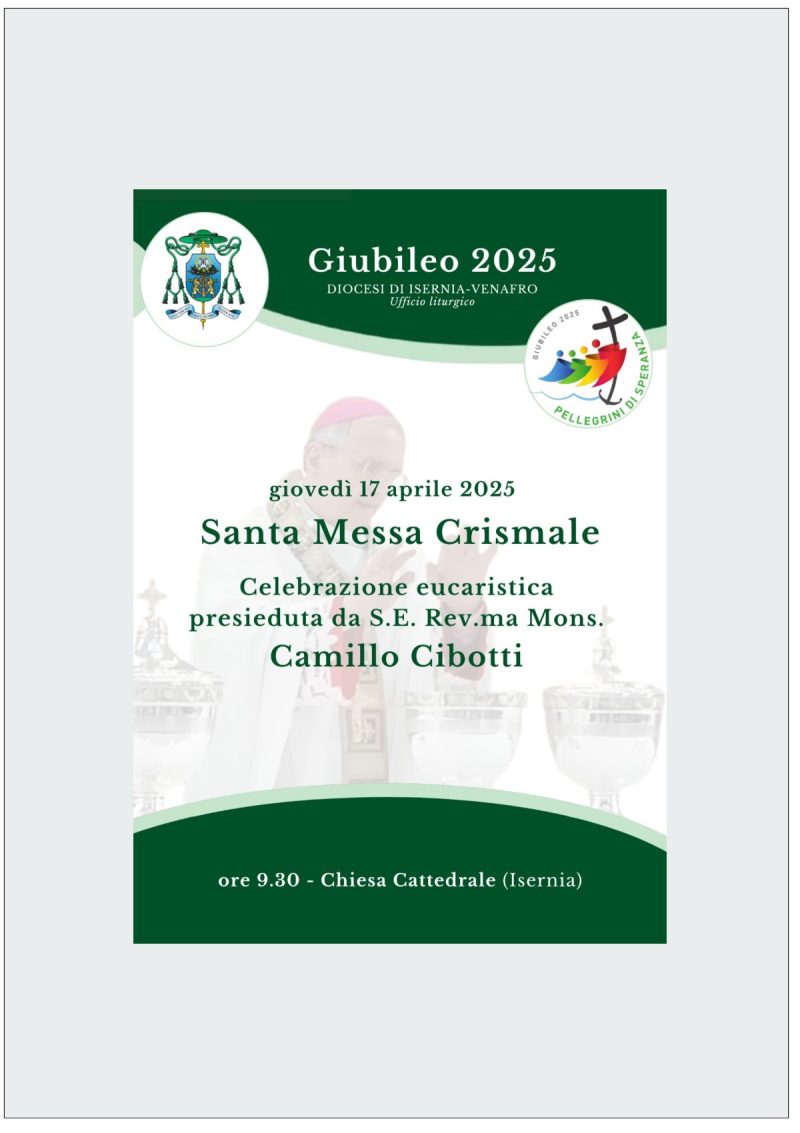 Giovedì 17 aprile 2025 ore 9.30 Cattedrale di Isernia ci sarà la celebrazione eucaristica della Santa Messa Crismale presieduta da Sua Eccellenza Monsignor Camillo Cibotti –
