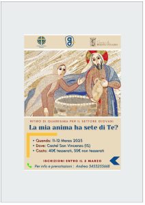 sabato 11 e domenica 12 marzo 2023 – presso l’abbazia di Castel San Vincenzo – Siete pronti per il ritiro di Quaresima – SAVE THE DATE – 11-12 marzo presso l’abbazia di Castel San Vincenzo Costo: 40 euro per i tesserati di Ac, 50 per i non tesserati Rivolto a giovani dai 14 ai 30 […]