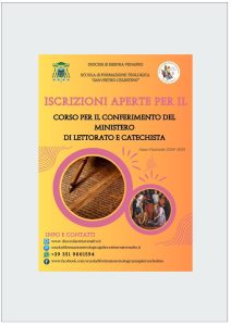 Da Gennaio a Maggio 2025 la SCUOLA di FORMAZIONE TEOLOGICA “SAN PIETRO CELESTINO” tiene il Corso per il conferimento del Ministero di LETTORATO e CATECHISTA per l’Anno Pastorale 2024-2025 – Tutti i dettagli sono indicati sulla brochure allegata [apri] Modulo iscrizione corso Lettorato Modulo iscrizione corso Catechista fr. Mariano Di Vito OFMCap Direttore Scuola Diocesana […]