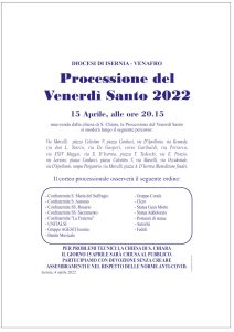 Venerdì 15 Aprile 2022, dalle ore 20,15 – Muovendo dalla chiesa di S. Chiara, la Processione si snoderà lungo il seguente percorso: Via Marcelli, piazza Celestino V, piazza Carducci, via D’Apollonio, via Kennedy, via don L. Sturzo, via De Gasperi, corso Garibaldi, via Petrarca, via XXIV Maggio, via E. D’Isernia, piazza T. Tedeschi, via E. […]