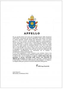 il 2 marzo 2022 – mercoledì delle ceneri – invito del Papa a fare una giornata di digiuno per la pace