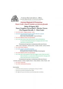 sabato 28 agosto 2021 dalle 9,00 alle 20,00 – L’annuale Convegno organizzato dalla Consulta di Pastorale Familiare Abruzzo-Molise si terrà quest’anno a Chieti Scalo, sabato 28 agosto dalle 9,00 alle 20,00. La location scelta è il Nuovo Complesso Parrocchiale San Martino Vescovo che accoglierà le famiglie provenienti dalle varie diocesi di Abruzzo e Molise, per […]