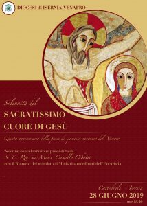 28 giugno 2019 – ore 18.30 – Cattedrale Isernia – Solennità del Sacratissimo Cuore di Gesù Quinto anniversario della presa di possesso canonico del Vescovo Solenne Concelebrazione presieduta da S.E. Rev.ma Mons. Camillo Cibotti con il Rinnovo del mandato ai Ministri straordinari dell’Eucarestia