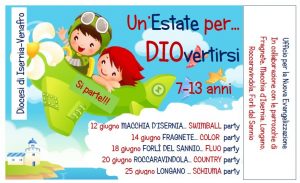Un’estate per DIOvertirsi: si parte!!! Al via il 12 giugno il campus itinerante per vivere l’estate nella fede e nella gioia L’Ufficio per la Nuova Evangelizzazione anche quest’anno organizza il campus itinerante “Un’estate per DIOvertirsi”, in collaborazione con le parrocchie di Fragnete, Macchia d’Isernia, Longano, Roccaravindola, Forlì del Sannio. L’iniziativa, aperta a tutti i bambini […]