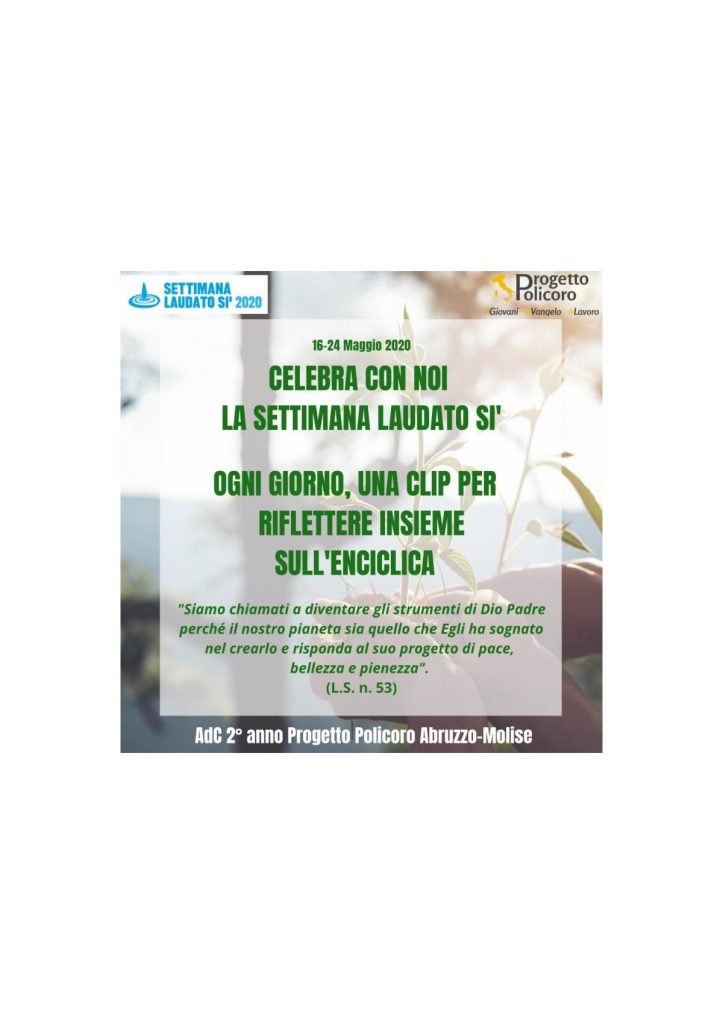 Ogni giorno, a partire dal 16 maggio, in collaborazione con il Progetto Policoro delle altre diocesi dell’ Abruzzo-Molise, pubblicheremo sulle nostre pagine FB e sul canale youtube della Diocesi una video-riflessione per ripercorrere insieme l’enciclica a 5 anni dalla sua pubblicazione
