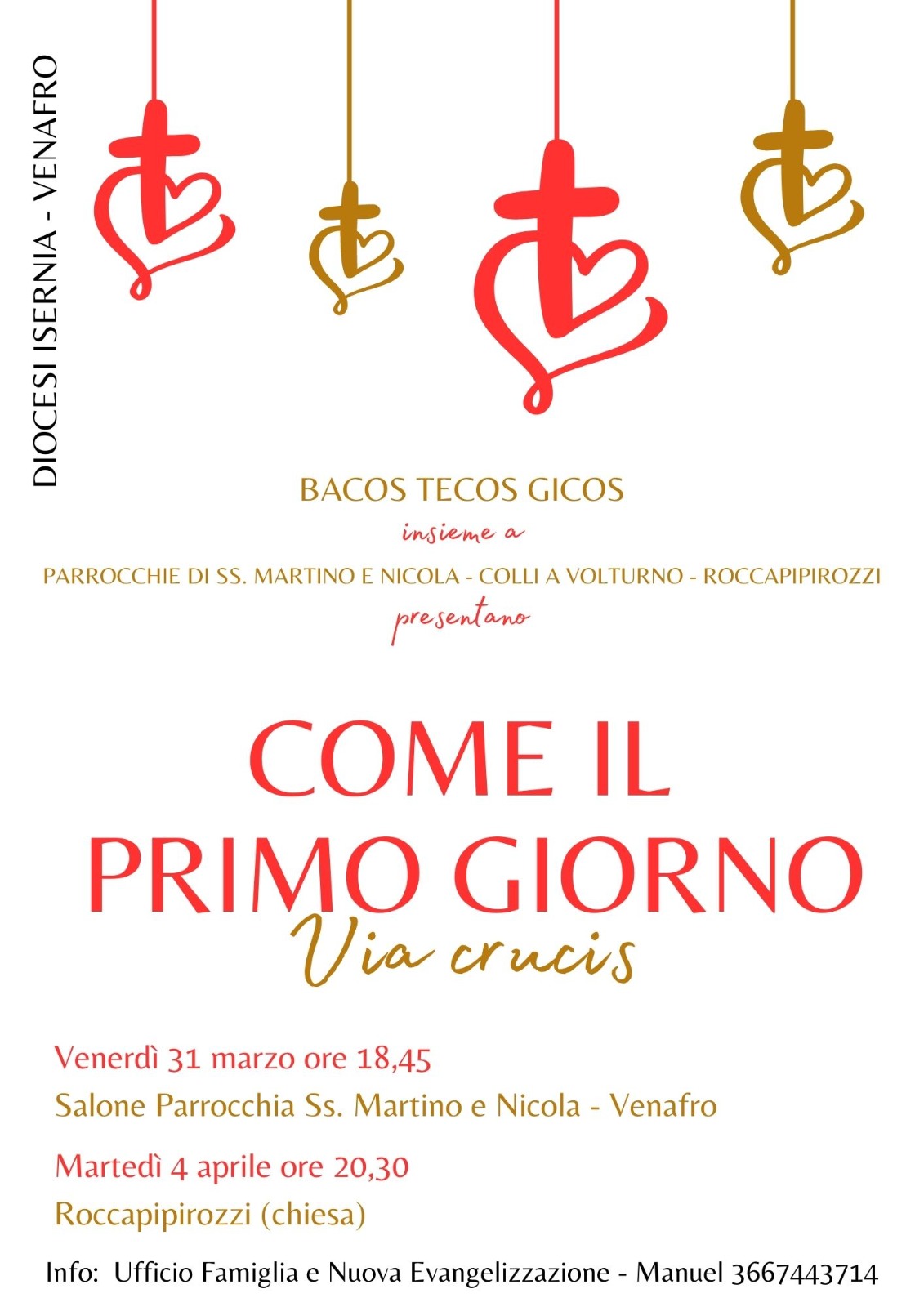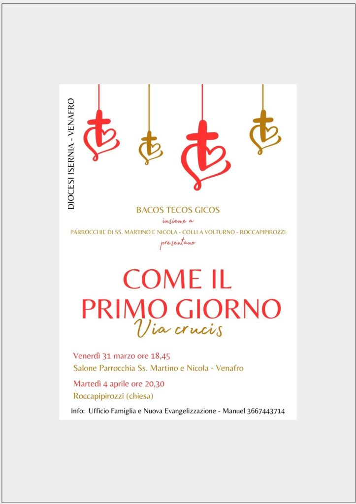 Le ultime ore della via di Gesù, in chiave moderna, capaci di parlare ancora ai giovani e alle famiglie di oggi. È questo “COME IL PRIMO GIORNO… Via crucis”, lo spettacolo di evangelizzazione che l’Ufficio Famiglia e Nuova Evangelizzazione della diocesi mette in scena nei prossimi giorni. Oltre 70 i protagonisti: i Bacos, i Tecos e i Gicos, già impegnati da tempo in attività come questa, avranno il piacere di unirsi ai bambini del nascente oratorio della parrocchia Ss. Martino e Nicola di Venafro, ai giovani della parrocchia di Roccapipirozzi e a quelli della parrocchia di Colli a Volturno. Per camminare insieme, parroci, bambini, giovani e famiglie e portare agli altri Gesù, il suo messaggio sempre vero e trasformante, attraverso uno spettacolo realizzato ancora una volta con la metodologia ABC (animazione biblica creativa), per parlare oltre le parole e raggiungere direttamente il cuore degli spettatori.