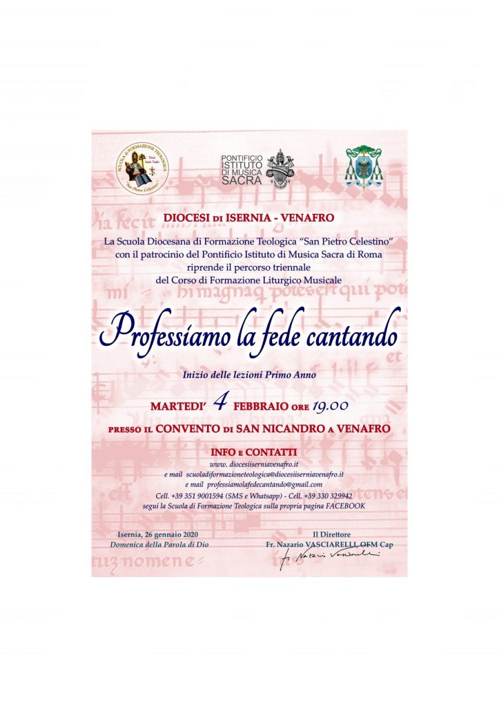Iniziando un nuovo corso triennale, con la novità che il corso si terrà a Venafro presso il salone del Convento dei Frati Cappuccini, auspico, innanzi tutto che ci sia un ulteriore coinvolgimento di tutte le comunità parrocchiali che, soltanto per motivi logistici non hanno potuto partecipare agli incontri precedentemente tenutisi ad Isernia, che quanto verrà seminato produca il frutto desiderato, trovi un terreno accogliente, e che tutto il popolo santo di Dio della nostra santa Chiesa di Isernia – Venafro viva le liturgie assembleari, non come una semplice esibizione canora ma come occasione per celebrare “degnamente” le lodi del Signore.