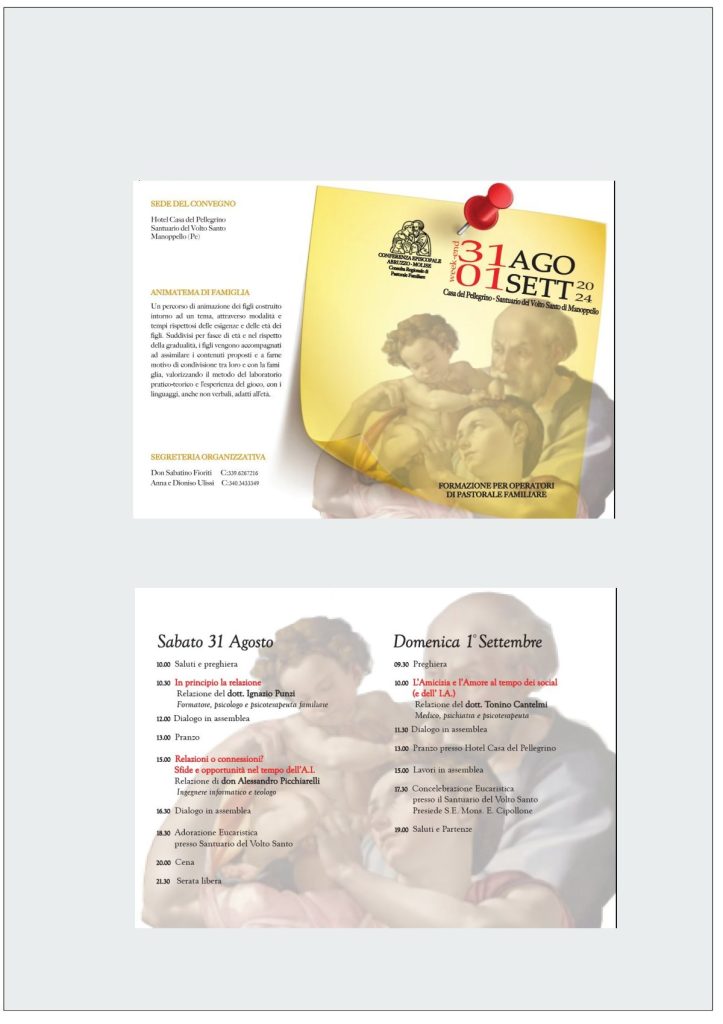 La Pastorale Familiare di Abruzzo e Molise ha organizzato un importante evento formativo per famiglie e laici che si terrà sabato 31 agosto e domenica 1° settembre a Manoppello (CH).