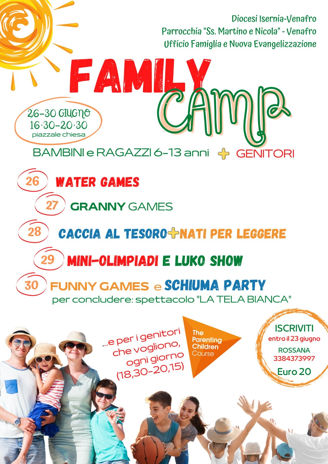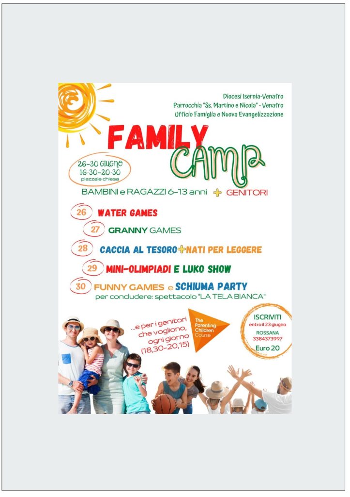 in collaborazione con l’Ufficio Famiglia e Nuova Evangelizzazione, dal 26 al 30 giugno vivrà il primo FAMILY CAMP. Un esperimento nuovo che vedrà insieme, contemporaneamente, bambini e genitori, alle prese con tante attività divertenti, momenti di riflessione e spiritualità. L’iniziativa è stata possibile grazie all’ispirazione del parroco, Don Rocco Iannacone, che lo scorso inverno ha lanciato l’idea di rilanciare, accanto alle attività catechetiche già presenti in parrocchia, altre iniziative per i bambini e le famiglie, trovando da subito la disponibilità di tanti genitori desiderosi di mettersi in gioco. A questi poi, nel giro di poco tempo, si sono aggiungi diversi giovani adolescenti pieni di entusiasmo per cimentarsi ne ruolo di animatori, sia dei giochi che di uno spettacolo che verrà messo in scena l’ultima sera. Il tema è quello della NON omologazione, della gioia di essere unici e accoglienti della diversità di ciascuno. A sostenere la nascente iniziativa ci saranno anche, accompagnati dai loro genitori, i Bacos (Baby con le scarpe) e Tecos (Teen con le scarpe) che offriranno ogni giorno, prima di tuffarsi nei giochi, una ABC (Animazione Biblica Creativa), insieme ai Gicos (Giovani con le scarpe) sempre pronti a ravvivare le giornate con giochi coinvolgenti.