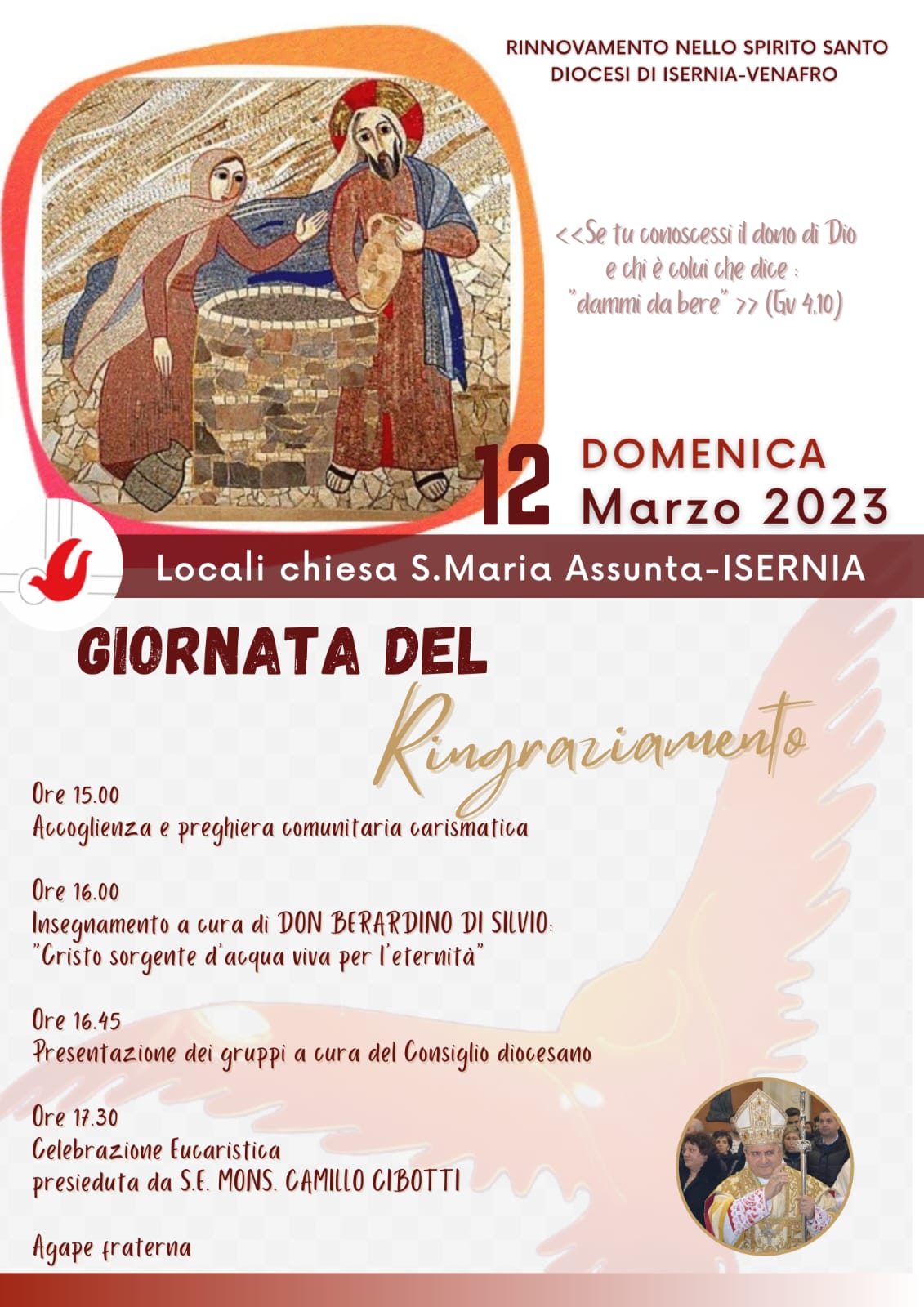 Ci ritroveremo presso i locali della parrocchia S.Maria Assunta per vivere un pomeriggio  di preghiera, condivisione della vita dei gruppi, presenti nella nostra diocesi (Gruppo “ Maria “ e “ Nuova Gerusalemme “, in Isernia; Cenacolo “Il Consolatore”, in Venafro e gruppo “ Michele Arcangelo”, in Colli a Volturno)  ascolto dell’insegnamento, a cura di don Berardino Di Silvio, sul  Vangelo di Giovanni 4, 1-35, dal titolo “ Cristo sorgente di acqua viva per l’eternità” e la visione del video, preparato dal Nazionale, che ripercorre le tappe più significative del RnS, sino ad oggi.