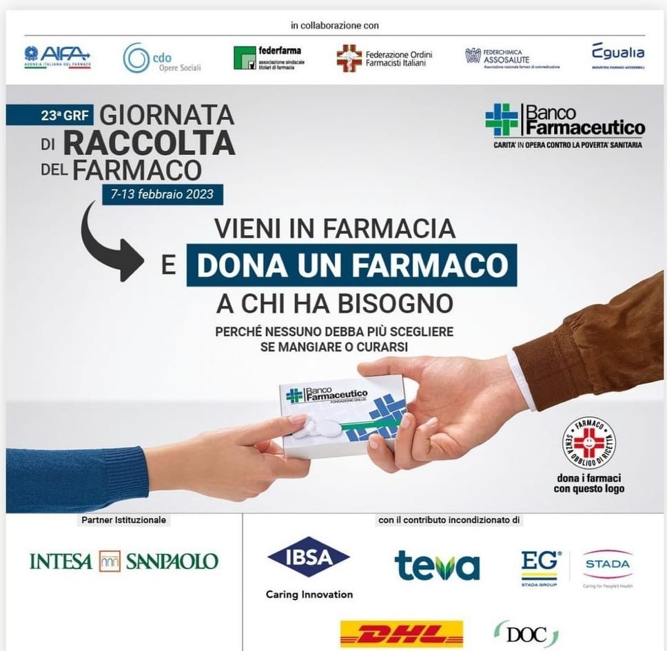 saremo presenti con volontari del Banco Farmaceutico presso la farmacia dei Pentri di Isernia e presso le farmacie Sardella; Del Corso e Santa Daria di Venafro, però i farmaci da banco possono essere donati anche negli altri giorni dal 7 al 13 febbraio. Grazie.