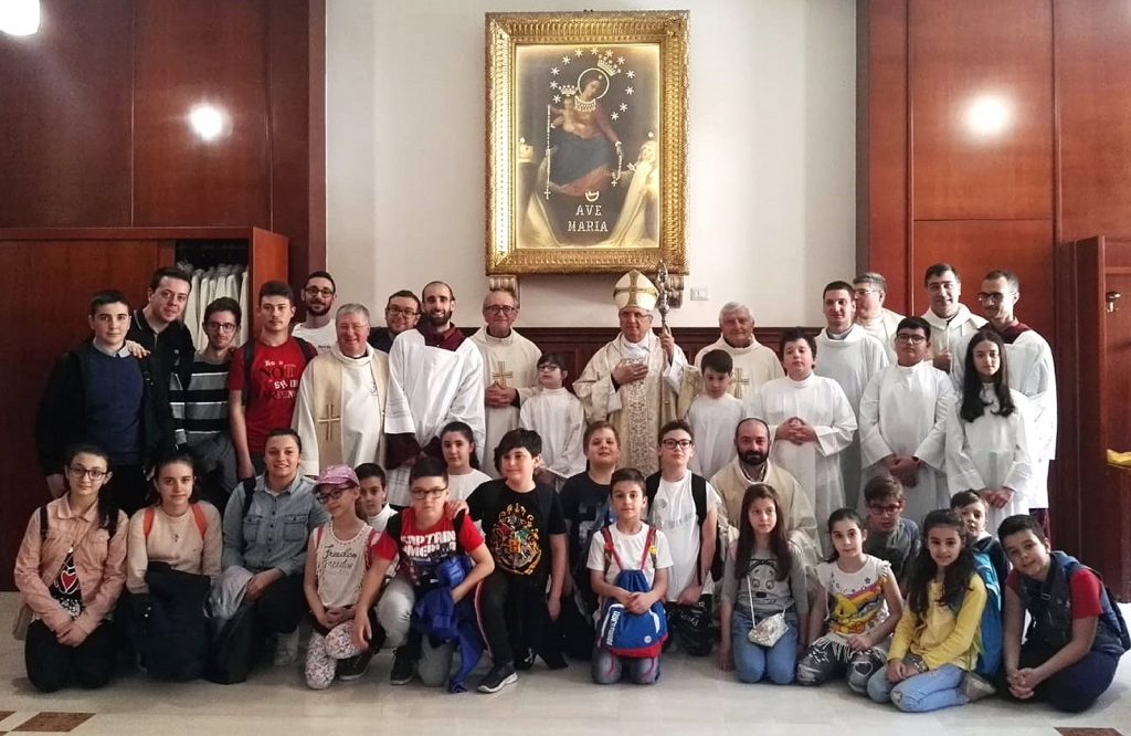 Giovedì 25 aprile i ministranti della nostra diocesi si sono recati presso il santuario della Beata Vergine del Santo Rosario di Pompei per vivere tutti insieme la giornata diocesana del ministrante. Un incontro molto atteso da tutti i bambini e i ragazzi nel quale hanno potuto fare amicizia con i loro coetanei che nelle altre parrocchie della nostra diocesi svolgono lo stesso servizio all’altare. All’incontro hanno preso parte i ministranti di diverse parrocchie della Diocesi: san Pietro Apostolo nella Cattedrale e Assunzione di Maria Vergine di Isernia, le parrocchie dei santi Simeone e Caterina e Martino e Nicola di Venafro, e le parrocchie di Capriati a Volturno, Ciorlano e Mastrati; hanno accompagnato diversi parroci e animatori. L’incontro ha visto inoltre la presenza del nostro Vescovo che ci ha accompagnati in tutta la giornata. All’arrivo a Pompei il Vescovo ha celebrato la Santa Messa insieme agli altri sacerdoti; all’inizio della celebrazione siamo stati accolti e salutati dall’Arcivescovo Prelato di Pompei mons. Tommaso Caputo che nel suo saluto ci ha spronati a vivere sempre di più e sempre meglio la nostra devozione alla Beata Vergine Maria in particolare attraverso la preghiera del Rosario. Il nostro Pastore mons. Cibotti nell’omelia ci ha ricordato che, sull’esempio di Maria, il nostro servizio nelle celebrazioni liturgiche deve essere anzitutto un atto d’amore per Gesù che si dona a noi nel suo Corpo e nel suo Sangue e che da questo servizio dobbiamo ripartire sempre rigenerati per annunciare agli altri la nostra fede in Gesù risorto. Nel pomeriggio, prima di ripartire, abbiamo avuto l’opportunità di ascoltare una testimonianza di amore e di carità perché Pompei è anche un laboratorio di solidarietà e un luogo di promozione umana. Un consacrato della congregazione dei Fratelli delle Scuole Cristiane, fondata da San Giovanni Battista de La Salle, ci ha illustrato la grande opera di carità voluta fortemente dal fondatore del Santuario di Pompei, il beato Bartolo Longo, che ha istituito un convitto per la formazione umana e cristiana di tanti ragazzi, figli di detenuti, che, vittime del disagio sociale, hanno trovato una casa e una famiglia accoglienti. La testimonianza ha suscitato in tutti, dai più grandi ai più piccoli, tanto interesse. In conclusione, ringraziando tutti coloro che nel Santuario di Pompei si sono prodigati per l’accoglienza, possiamo dire di aver vissuto una bella giornata all’insegna dell’amicizia tra di noi e con Gesù.