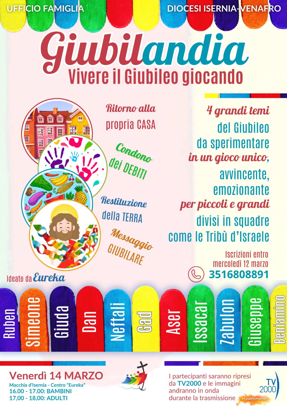 I grandi temi biblici del Giubileo (restituzione della terra, restituzione delle case, condono dei debiti) saranno sperimentati “in prima persona”, attraverso un gioco, coinvolgente ed emozionante, per piccoli e grandi. Con Giubilandia i partecipanti, dal vivo, divisi in 11 squadre che porteranno il nome delle Tribù d’Israele, potranno vivere i temi giubilari e alla fine fare il Giubileo insieme.