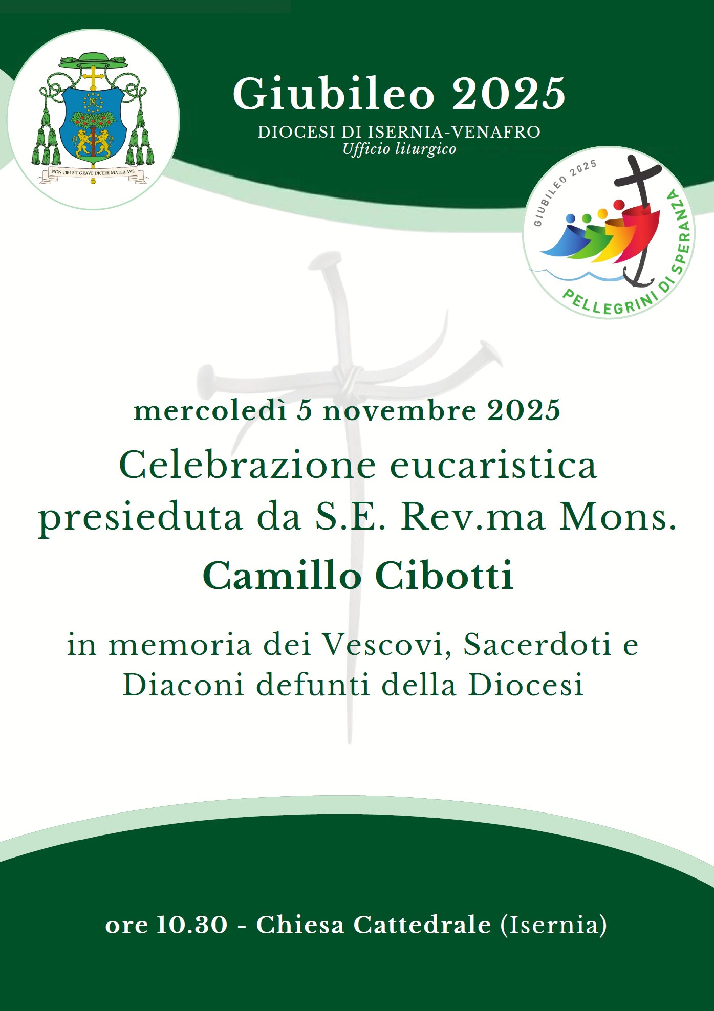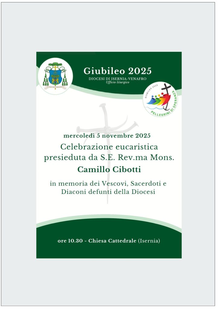 Mercoledì 5 novembre 2025 ore 10.30 Cattedrale di Isernia – Celebrazione eucaristica presieduta da S.E. Rev.ma Mons. Camillo Cibotti in memoria dei Vescovi, Sacerdoti e Diaconi defunti della Diocesi