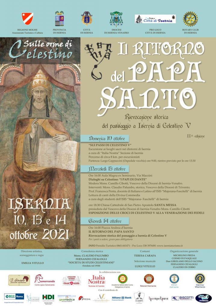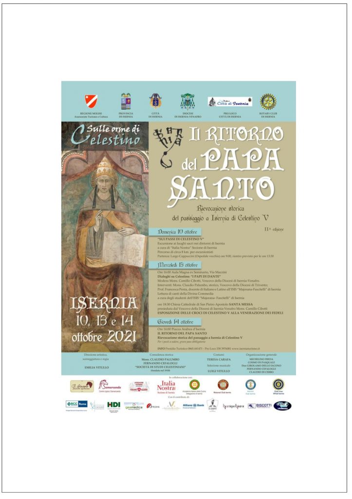Con un cartellone denso di eventi si svolge quest’anno la seconda edizione della rievocazione del passaggio di Papa Celestino V nella sua Isernia avvenuto storicamente il 14 e il 15 ottobre del 1294. La tradizione storico-ecclesiale locale lega a questo momento il dono fatto dal pontefice al capitolo cattedrale di due preziose croci, tuttora gelosamente custodite.