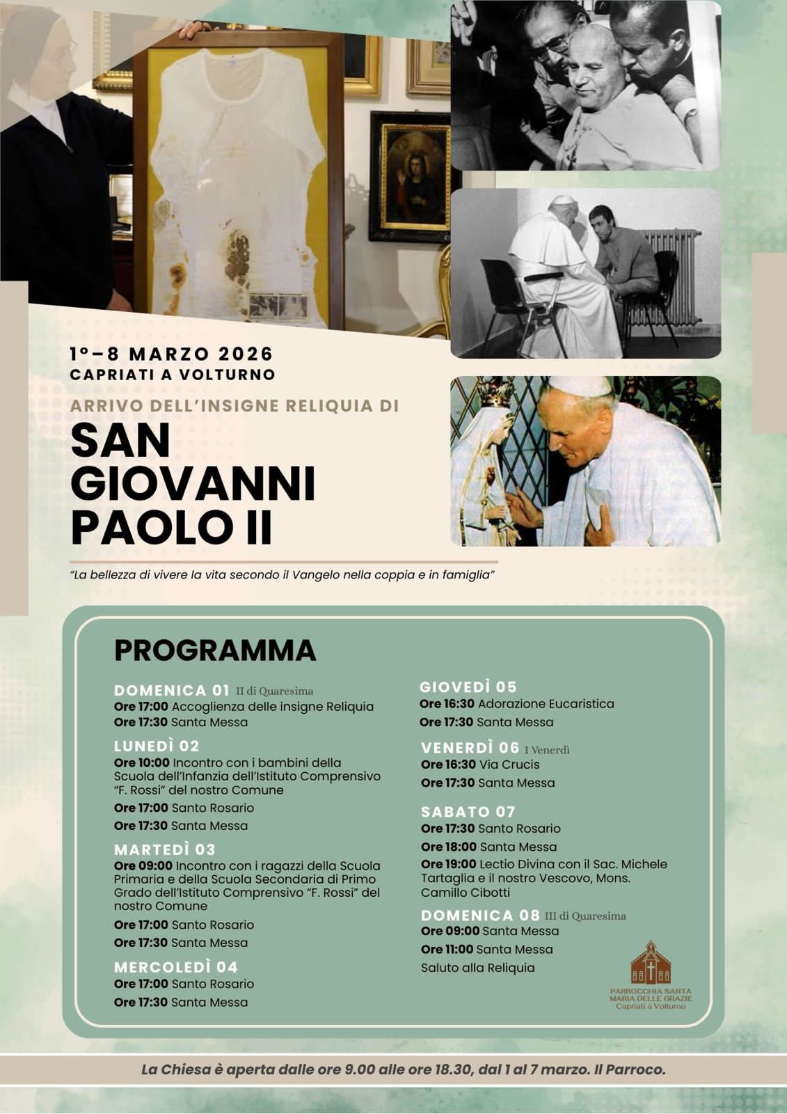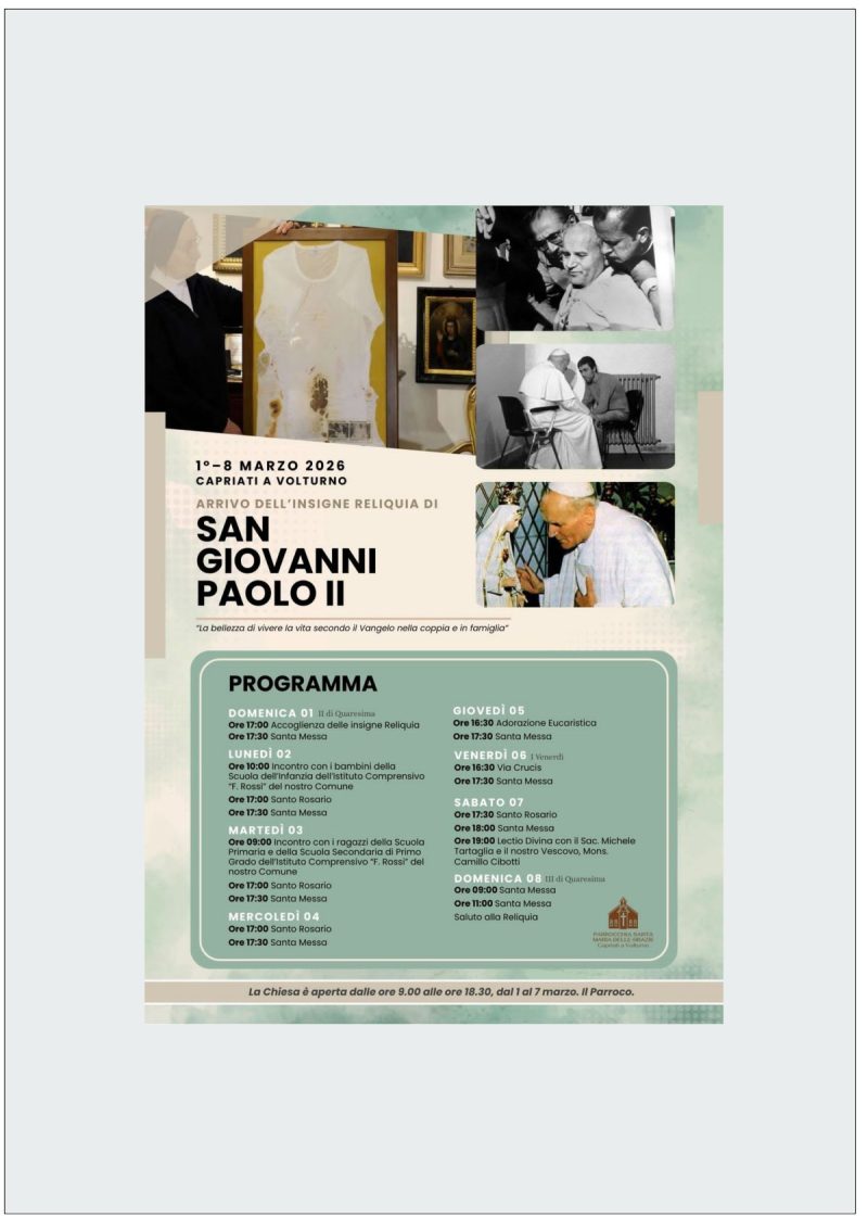 Dal 1° all’8 MARZO 2026 CAPRIATI A VOLTURNO ARRIVO DELL’INSIGNE RELIQUIA DI SAN GIOVANNI PAOLO II –