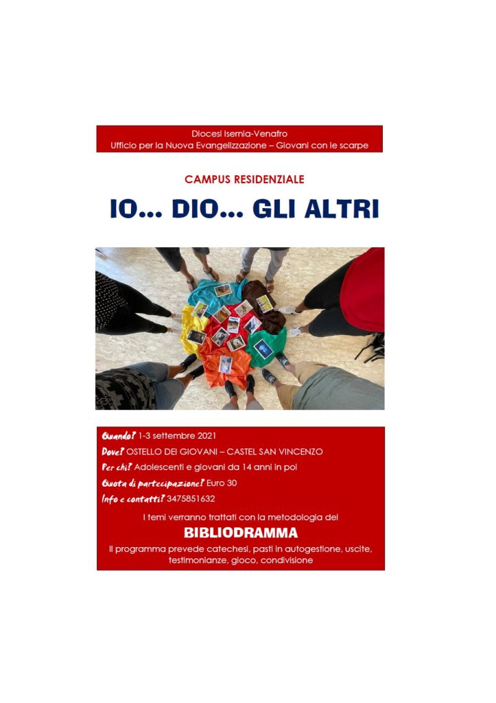 Il ritiro per adolescenti e giovani che si terrà dall’1 al 3 settembre nell’ostello dei giovani a Castel San Vincenzo, dal titolo: “IO… DIO… GLI ALTRI” è ispirato alle parole di Gesù che dice: “Amerai il Signore tuo Dio con tutto il tuo cuore, con tutta la tua anima e con tutta la tua mente. Questo è il grande e primo comandamento. Il secondo poi è simile a quello: Amerai il tuo prossimo come te stesso” (Mt 22,37-39). I partecipanti, attraverso la metodologia di evangelizzazione del Bibliodramma, potranno entrare nel cuore di questo messaggio di Gesù, in tre step: il primo rivolti a sé, il secondo a Dio, il terzo agli altri. La forma in autogestione permetterà ai ragazzi di cimentarsi anche nelle faccende di casa, dovendosi occupare loro stessi di cucinare e sistemare la struttura. L’invito è rivolto ai “Giovani con le scarpe” che già da tempo camminano insieme ma anche a chi volesse conoscere questa esperienza o semplicemente passare tre giorni di ritiro insieme a coetanei per un momento di condivisione e crescita personale.
