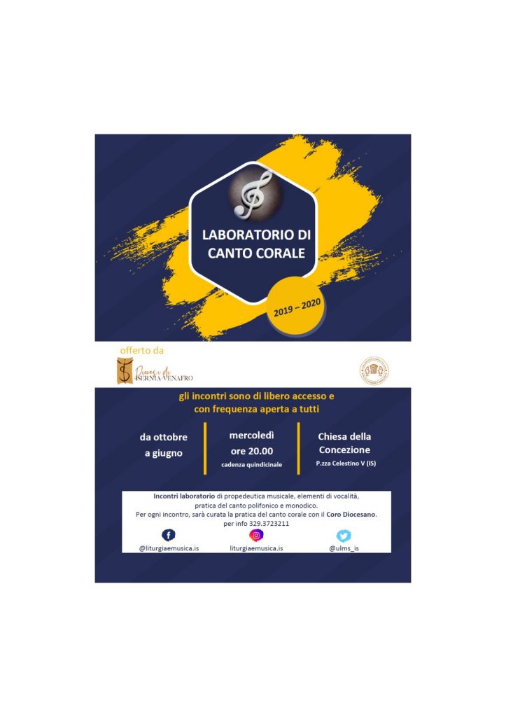 L’Ufficio diocesano per la Liturgia e la Musica Sacra si fa promotore, anche quest’anno, dell’organizzazione di un laboratorio di canto corale. Lo scopo è quello di avvicinare non solo chi ha già una certa pratica musicale, ma anche coloro che (per diversi motivi) non hanno mai provato un’attività che è certamente impegnativa. Pertanto, sarà possibile fare questo tipo di esperienza a partire dall’esercizio di gruppo. È facile capire come questa iniziativa sia importante per la diocesi, in quanto permette a tutti (soprattutto ai più giovani) di aprire i propri orizzonti a conoscenze nuove ― che dovrebbero essere almeno provate per un arricchimento culturale ― ed è in funzione di almeno due aspetti molto utili alla vita pastorale. Infatti, si vuole offrire a tutti questa opportunità affinché ci sia un arricchimento tanto nelle celebrazioni diocesane (come sta accadendo a partire dalla nascita del Coro Diocesano), quanto più per maturare un’esperienza stilistica che può tornare utile nelle singole parrocchie. Questa attività riprende dal 16 ottobre alle ore 20.00 e avrà come sede (almeno inizialmente) la chiesa della Concezione di Isernia. Gli incontri si svolgeranno durante tutto l’anno pastorale con una frequenza quindicinale e saranno strutturati in modo da essere prima di tutto propedeutici alla vocalità e all’apprendimento del canto corale ― tanto polifonico quanto monodico ― di destinazione liturgica. La parte vocale verrà seguita dal maestro Antonella Inno, mentre quella di pratica corale dal maestro Marco Di Lenola.