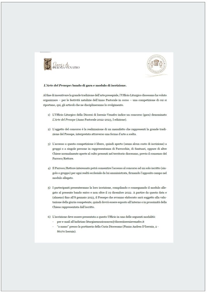 Al fine di incentivare la grande tradizione dell’arte presepiale, l’Ufficio Liturgico diocesano ha voluto organizzare – per le festività natalizie dell’Anno Pastorale in corso – una competizione riguardante la realizzazione di presepi di ogni stile.