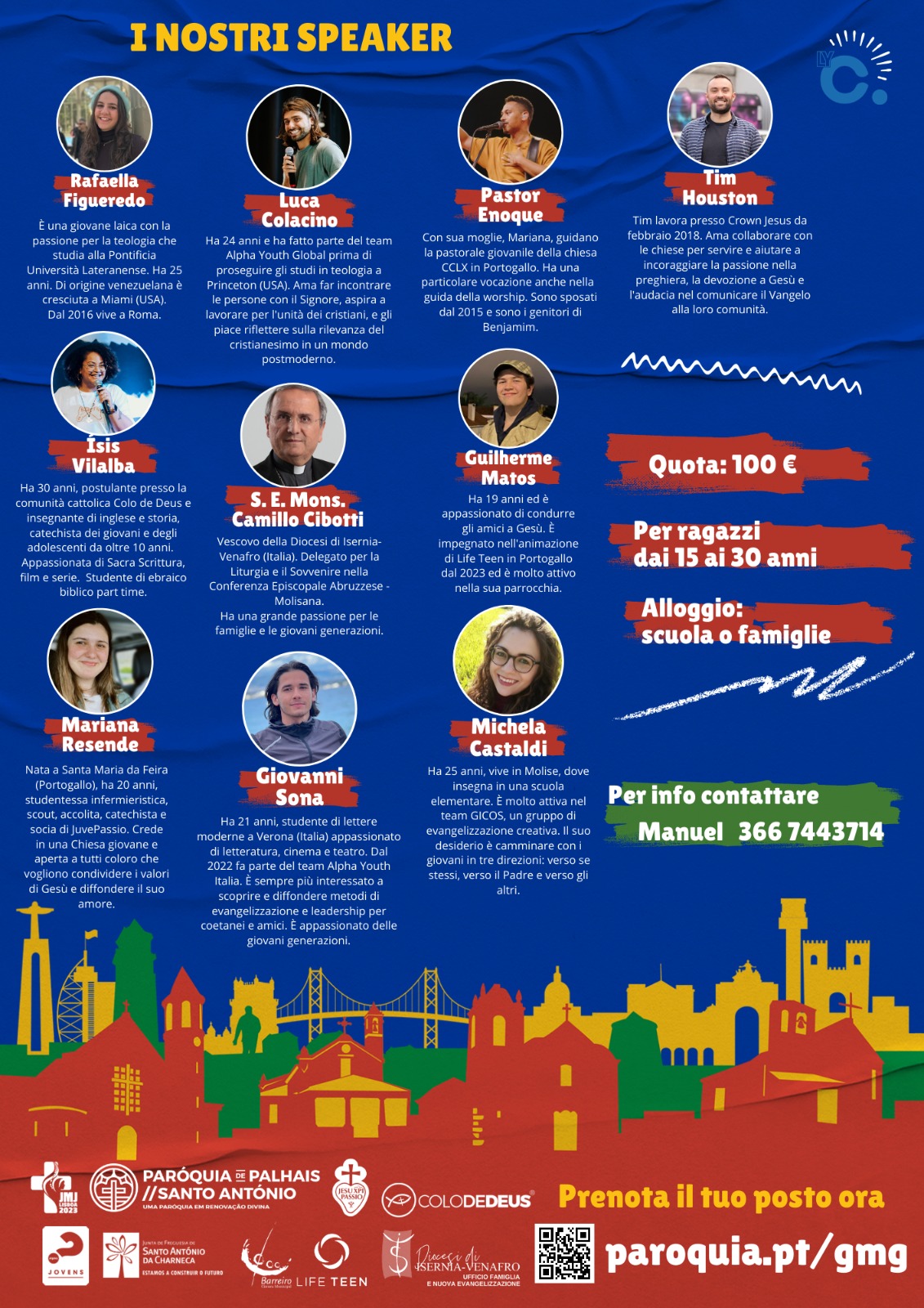 Dopo l’incredibile esperienza dello scorso anno a Macchia d’Isernia anche questa estate centinaia di giovani provenienti da diverse parti del mondo, si ritroveranno per vivere il LEADERSHIP YOUTH CAMP. La diocesi di Isernia-Venafro, mediante l’Ufficio Famiglia e Nuova Evangelizzazione, in collaborazione con Alpha Youth Italia e la diocesi di Setubal in Portogallo, promuove e coordina questo evento che si terrà a Palhais, vicino a Lisbona, dal 27 al 31 luglio. Dall’Italia saremo circa 80, e molti di questi provenienti dalla nostra diocesi. Nel programma, ricco di eventi, spicca la presenza di tanti speaker molto giovani ma anche molto desiderosi di inaugurare una nuova stagione di leader per la Chiesa e per il mondo. Con grande gioia, guiderà i giovani della nostra diocesi (ma un po’ tutto l’evento), il nostro Vescovo che oltre alla Celebrazione del 31 luglio e un workshop con sacerdoti e seminaristi sulla “Pastorale giovanile del futuro”, nell’adorazione dell’ultimo giorno darà il mandato missionario ai ragazzi che il giorno dopo partiranno per Lisbona dove ad attenderli ci saranno un milione di giovani pronti a vivere la Giornata Mondiale della Gioventù insieme a Papa Francesco.
