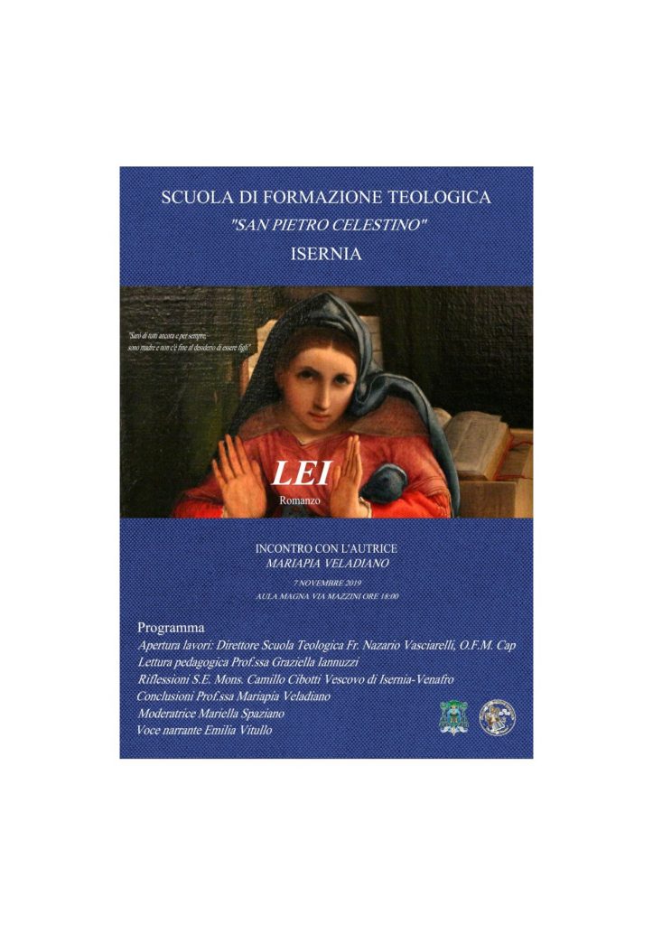 La Scuola di Formazione Teologica “San Pietro Celestino” ha organizzato, nell’ambito delle attività previste per il nuovo Anno di Formazione 2019 – 2020, l’evento: ‘Incontro con l’autrice Maria Pia Veladiano’, il 7 novembre prossimo, alle ore 18,00, nell’Aula Magna di via Mazzini a Isernia. La scrittrice vicentina presenterà il suo romanzo: ‘Lei’ (Guanda Edizioni), “la storia umanissima di Maria, Madre di Dio bambino, la stessa di ogni madre per cui il proprio bambino è Dio, vita che si consegna fragilissima e si promette eterna”. Nel romanzo parla Maria, “Accanto a lei Giuseppe, padre che ha detto sì senza comprendere, senza nemmeno pronunciare questo sì, costruttore di un progetto di vita e di amore ben più grande di quello immaginato. Intorno a lei uomini e donne che pensano di capire, ma sanno solo chiacchierare; e gli amici del figlio, Giovanni, Simone, Giuda e anche Nicodemo, che si affannano di domande nella notte; e dottori e farisei che chiedono la verità solo per poterla negare”. Sopra di lei ci sono gli angeli che le fanno da corona, “ma con le loro ali non riescono a tenere lontano il gran male del mondo, che si addensa fino a quando qualcuno griderà: A morte. Ciò che resta è un corpo rotto senza grazia, consegnato a una madre ancora giovane, anche nel momento estremo così simile a tante madri. Ma questa è una storia troppo immensa perché tutto possa andare perduto”. Il programma della serata prevede diversi momenti: i lavori saranno aperti dal Direttore della Scuola Teologica, Fr. Nazario Vasciarelli O.F.M. Cap, seguirà la lettura pedagogica del romanzo della Prof.ssa Graziella Iannuzzi e con la voce narrante della Dott.ssa Emilia Vitullo, le riflessioni del Vescovo della Diocesi di Isernia-Venafro, S.E. Mons. Camillo Cibotti, e le conclusioni dell’autrice. Moderatrice la giornalista Mariella Spaziano.