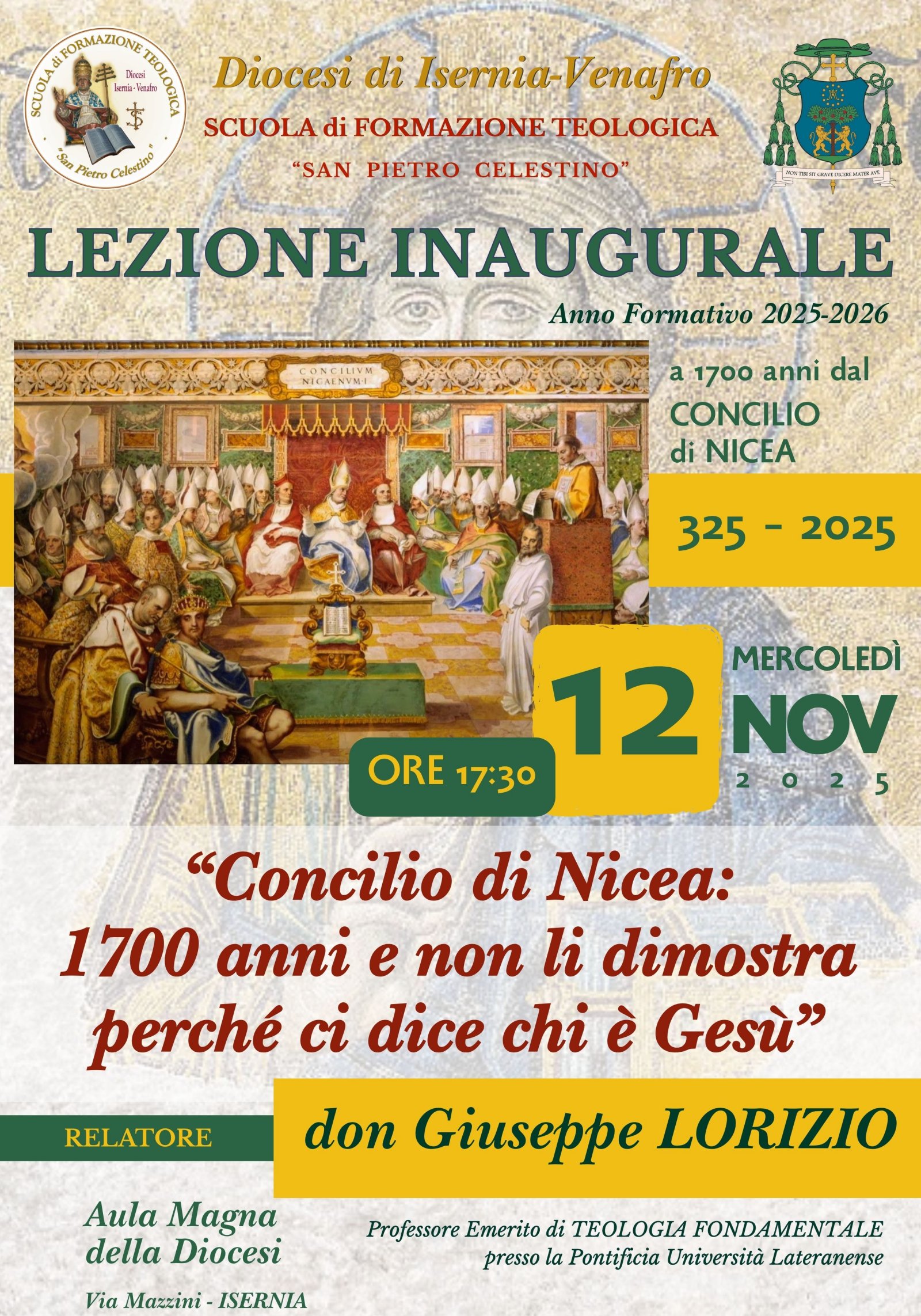 Mercoledì 12 Novembre 2025 alle ore 17.30, presso l’Aula Magna della Diocesi in via Mazzini ad Isernia, si terrà la Lezione Inaugurale del XIX Anno Formativo della Scuola Diocesana di Formazione Teologica.