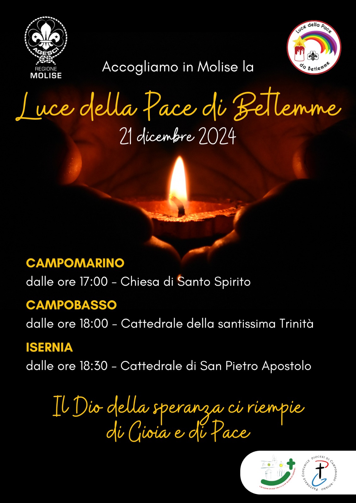 Agesci Molise vi invita calorosamente a ricevere la Luce della Pace, che da Betlemme arriva in tutta Europa ogni anno portata dagli scout. Arriverà in tutto il Molise dalla staffetta ferroviaria e qui a Isernia sabato 21; chi vorrà potrà vivere un momento di giochi e musica in attesa della luce alle 18:30 fuori la Cattedrale e di riflessione sulla Pace dentro la chiesa.