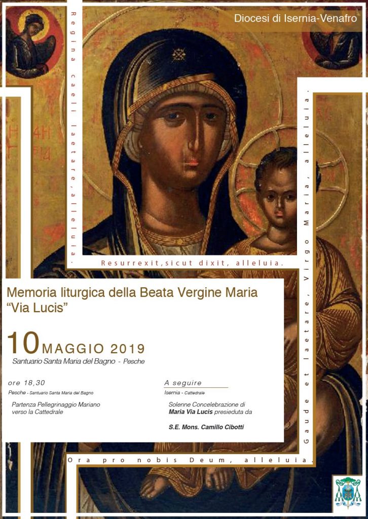 In occasione della festa di Maria “Via Lucis”, la diocesi di Isernia-Venafro, organizza la quinta edizione del pellegrinaggio a piedi dal santuario di Santa Maria del Bagno di Pesche fino alla Cattedrale di Isernia. Il cammino mariano si terrà venerdì prossimo 10 maggio a partire dalle ore 18,30. A quell’ora si raduneranno presso il santuario di Pesche i gruppi parrocchiali, i movimenti ecclesiali e tutti i fedeli per formare il lungo corteo che si snoderà da quel luogo attraverso le vie di Isernia fino a raggiungere la Cattedrale dove verrà celebrata la santa messa conclusiva presieduta dal vescovo di Isernia-Venafro, Mons. Camillo Cibotti. In questo mese di maggio dedicato alla Madonna, sarà un’occasione per celebrare solennemente Maria “Via della Luce”, il titolo con il quale viene venerata nella cappella laterale della cattedrale isernina. Il pellegrinaggio avrà la forma di una fiaccolata, con dei flambeaux che saranno distribuiti alla partenza, proprio ad indicare il significato della luce con cui la Beata Vergine Maria guida il cammino di ciascun uomo e donna e della Chiesa intera. Il percorso a piedi seguirà il seguente itinerario: Santuario Santa Maria del Bagno (Pesche), via Hertz, via Corpo Italiano di Liberazione (costeggiante il Centro Commerciale “In Piazza”), rotonda su viale dei Pentri, corso Risorgimento, via E. Ponzio, via Lorusso, piazza Celestino V, corso Marcelli, piazza della Cattedrale.