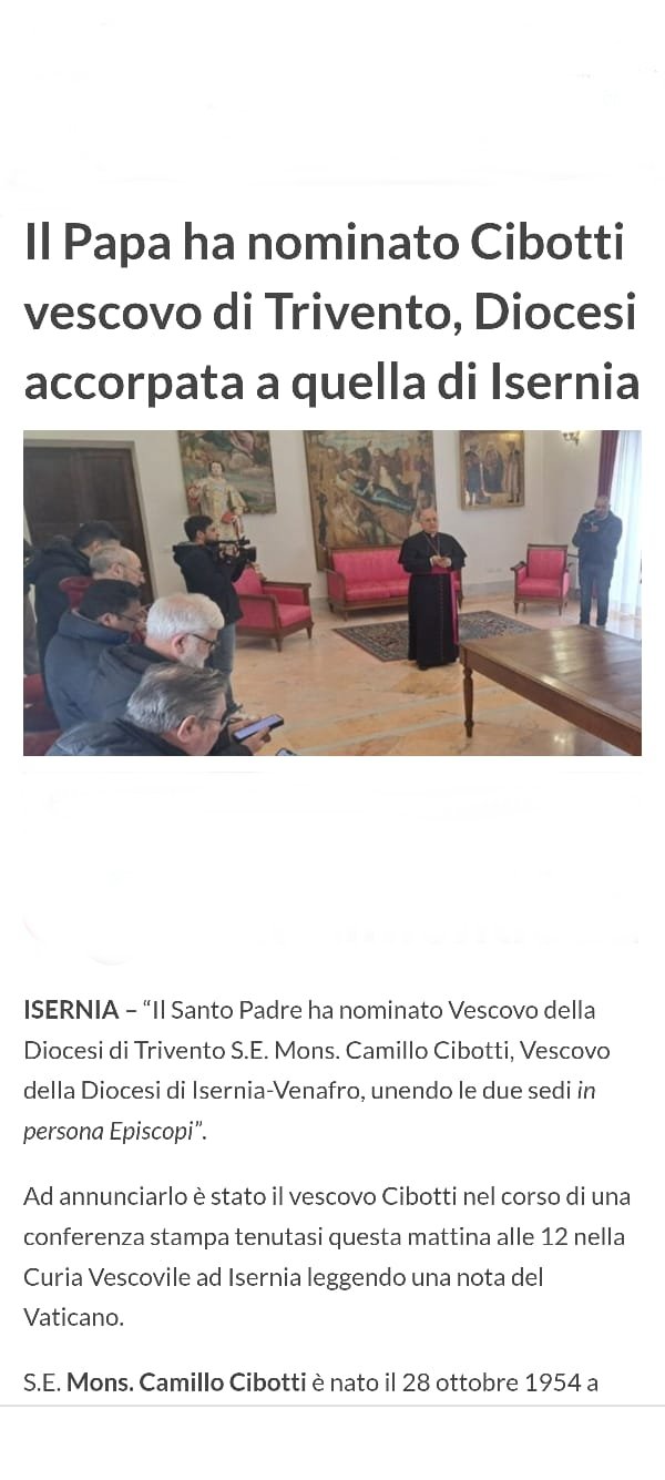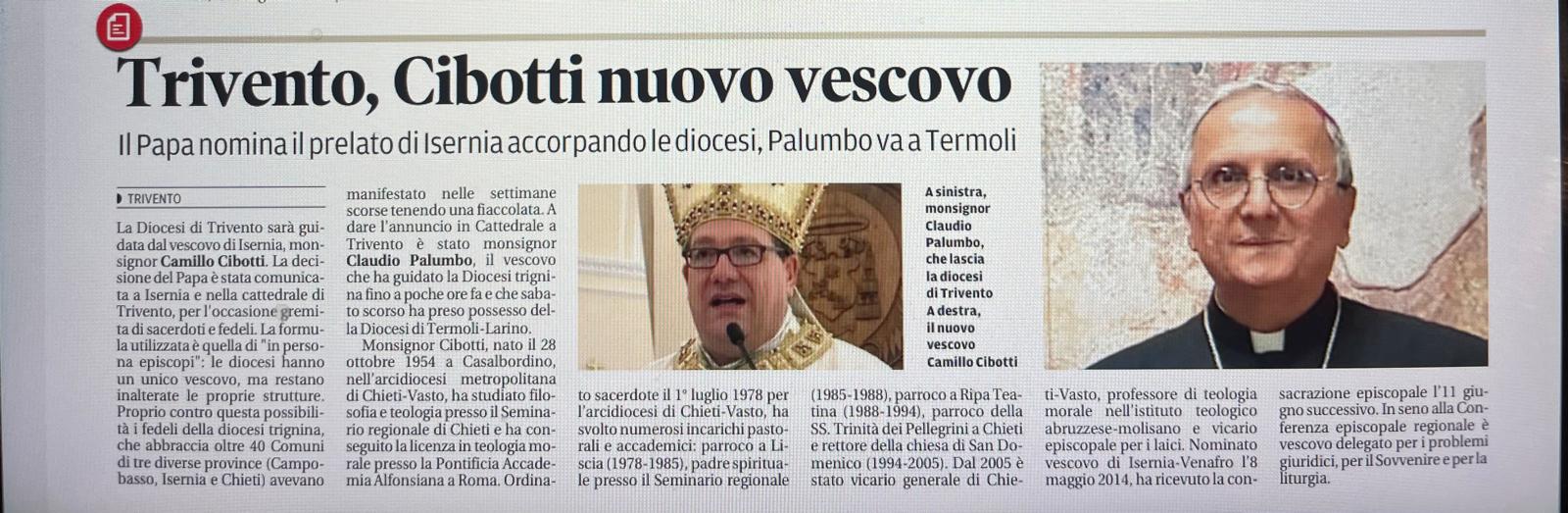 “Il Santo Padre, Papa Francesco, nella Sua benevolenza ha designato me all’esimia Cattedra di San Casto …” con queste parole il Vescovo di Isernia-Venafro Mons. Camillo Cibotti ha inteso salutare i fedeli della Diocesi di Trivento dove dal 23 febbraio 2025 è stato designato quale nuovo Vescovo. Nello specifico la nota del Vaticano riporta: “Il Santo Padre ha nominato vescovo della diocesi di Trivento monsignor Camillo Cibotti, vescovo della Diocesi di Isernia-Venafro, unendo le due sedi in persona Episcopi“.