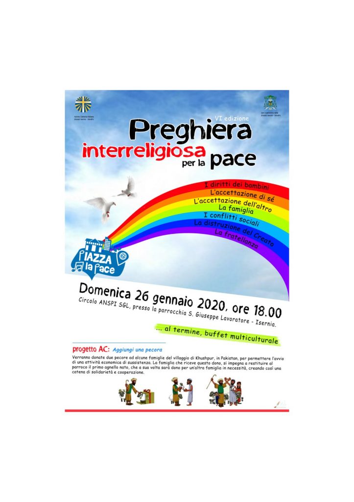presso il circolo Anspi Sgl, situato al di sotto della chiesa parrocchiale di San Giuseppe Lavoratore di Isernia ( zona San Lazzaro), l’Azione Cattolica diocesana presenterà la sesta edizione della preghiera interreligiosa della pace.