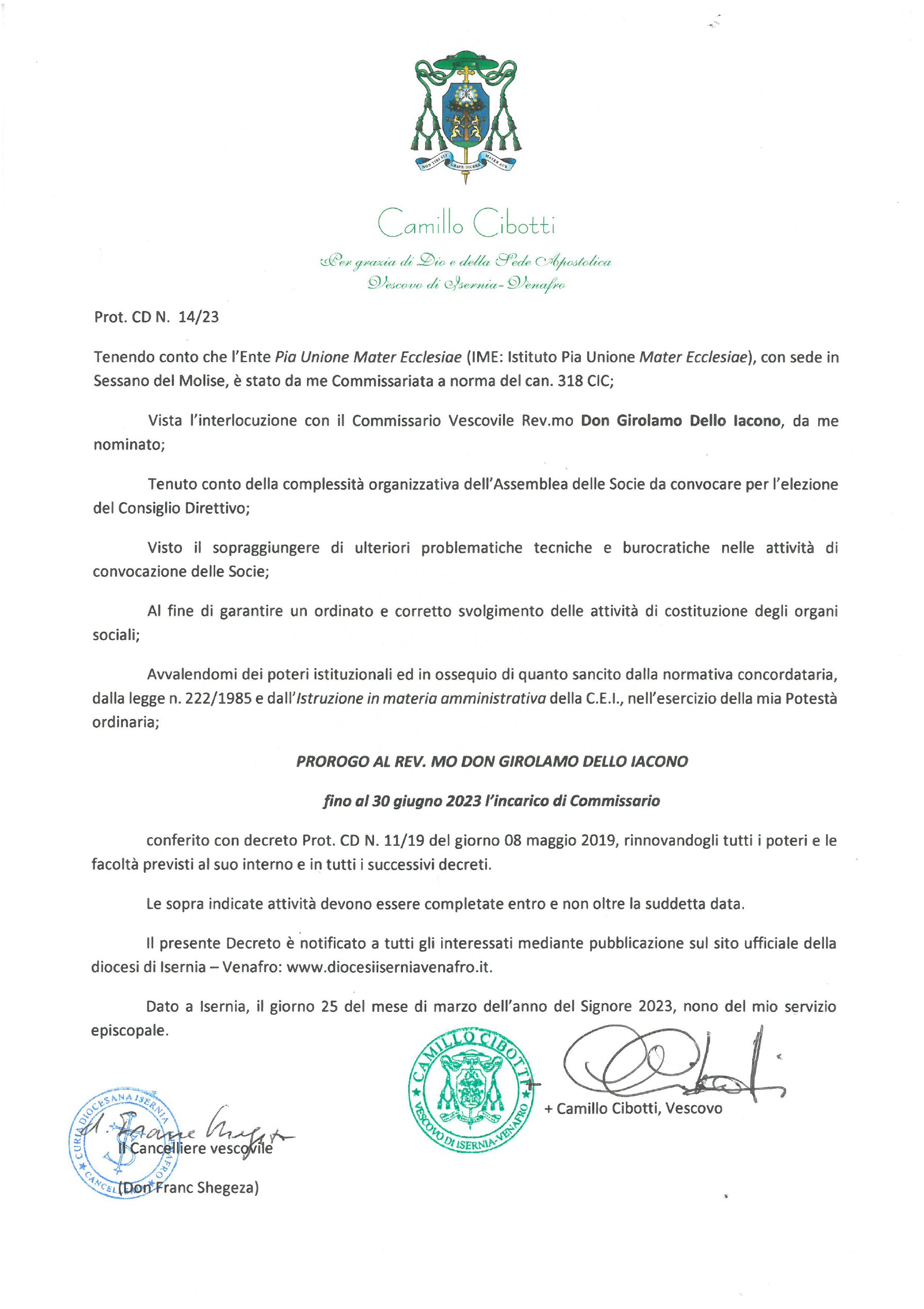 Proroga Commissario Vescovile