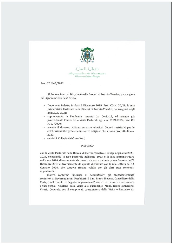 Nel nuovo Decreto il presule dispone che “la Visita Pastorale nella Diocesi di Isernia-Venafro si svolga negli anni 2023-­2024, celebrando la fase pastorale nell’anno 2023 e la fase amministrativa nell’anno 2024, diversamente da quanto disposto dal mio primo Decreto dell’8 Dicembre 2019 e diversamente da quanto dichiarato con la Lettera del 14 Gennaio 2020, che tuttavia rimane valida per gli altri suoi contenuti organizzativi”.