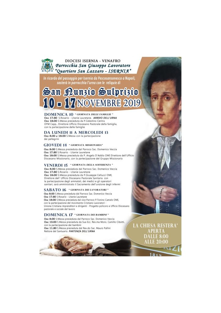Archivio news in primo piano San Nunzio Sulprizio Parrocchia San Giuseppe Lavoratore 10-17 novembre 2019 Parrocchia San Giuseppe Lavoratore In ricordo del passaggio per Isernia da Pescosansonesco a Napoli, sosterà in Parrocchia l’Urna con le Reliquie di San Nunzio Sulprizio FacebookTwitterLinkedin
