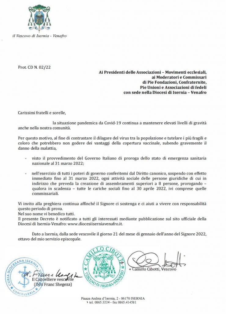 Archivio news in primo piano Sospensione attività Nota di Sua Eccellenza Mons. Camillo Cibotti di sospensione attività con effetto immediato: nota 02/22 [leggi] FacebookTwitterLinkedin