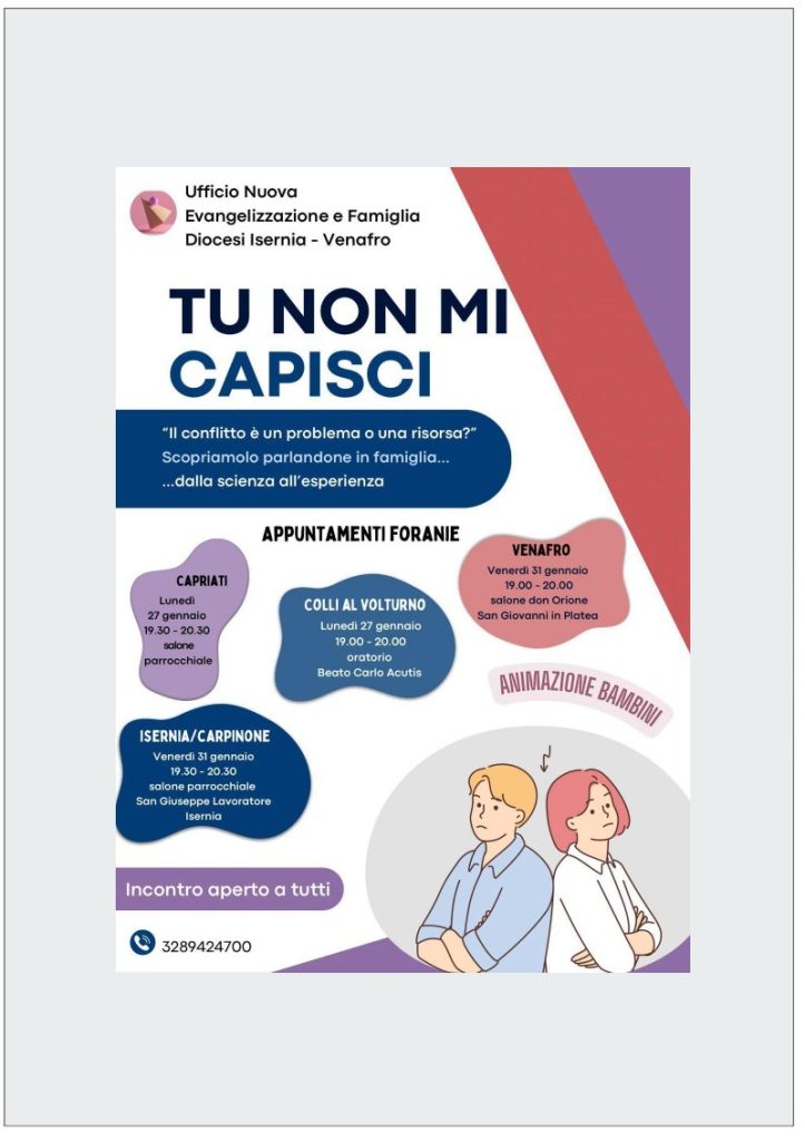 Venerdì 31 gennaio forania di Venafro ore 19.00 Salone Don Orione San Giovanni in Platea – per la forania di Isernia/Carpinone ore 19.30 Salone Parrocchiale San Giuseppe Lavoratore Isernia –