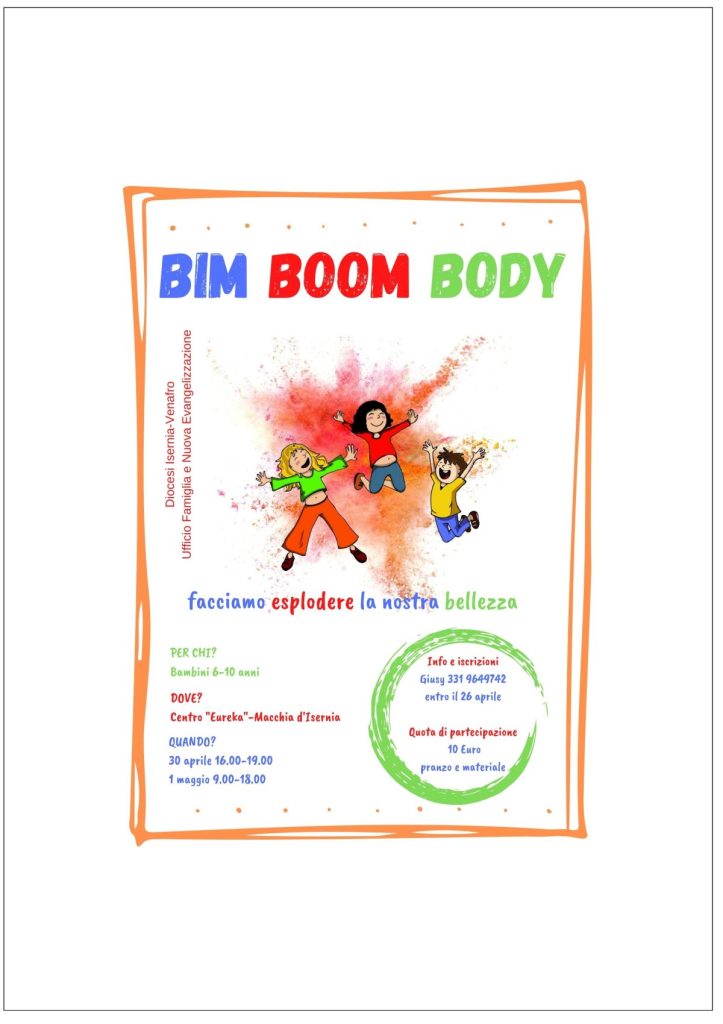 Il 30 aprile e 1 maggio 2022 – dopo due anni di preparazione l’equipe dell’Ufficio Famiglia e Nuova Evangelizzazione che ha lavorato alla creazione del corso BIM BOOM BODY è pronto per donarlo, per la prima volta, ai bambini da 6 a 10 anni, della nostra diocesi di Isernia-Venafro. L’evento si terrà a Macchia d’Isernia, nel neonato centro per la Famiglia e la Nuova Evangelizzazione “Eureka”. L’animazione sarà curata da un’equipe formata da me, insieme ad una coppia di sposi e la sua bimba (Giusy, Marco e Lara), Alfonsina, Anna, Clemente. Insieme ai Giovani con le scarpe (Jhonatan, Manuel, Donna, Michela, Angelo, Anna) che cureranno, in modo particolare, le rappresentazioni sceniche.