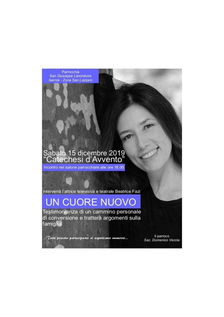 Archivio news in primo piano Un Cuore nuovo Catechesi d’Avvento 15 dicembre 2019 – ore 16.00 Catechesi d’Avvento Un Cuore nuovo Incontro nel salone parrocchiale San Giuseppe Lavoratore Zona San Lazzaro – Isernia FacebookTwitterLinkedin