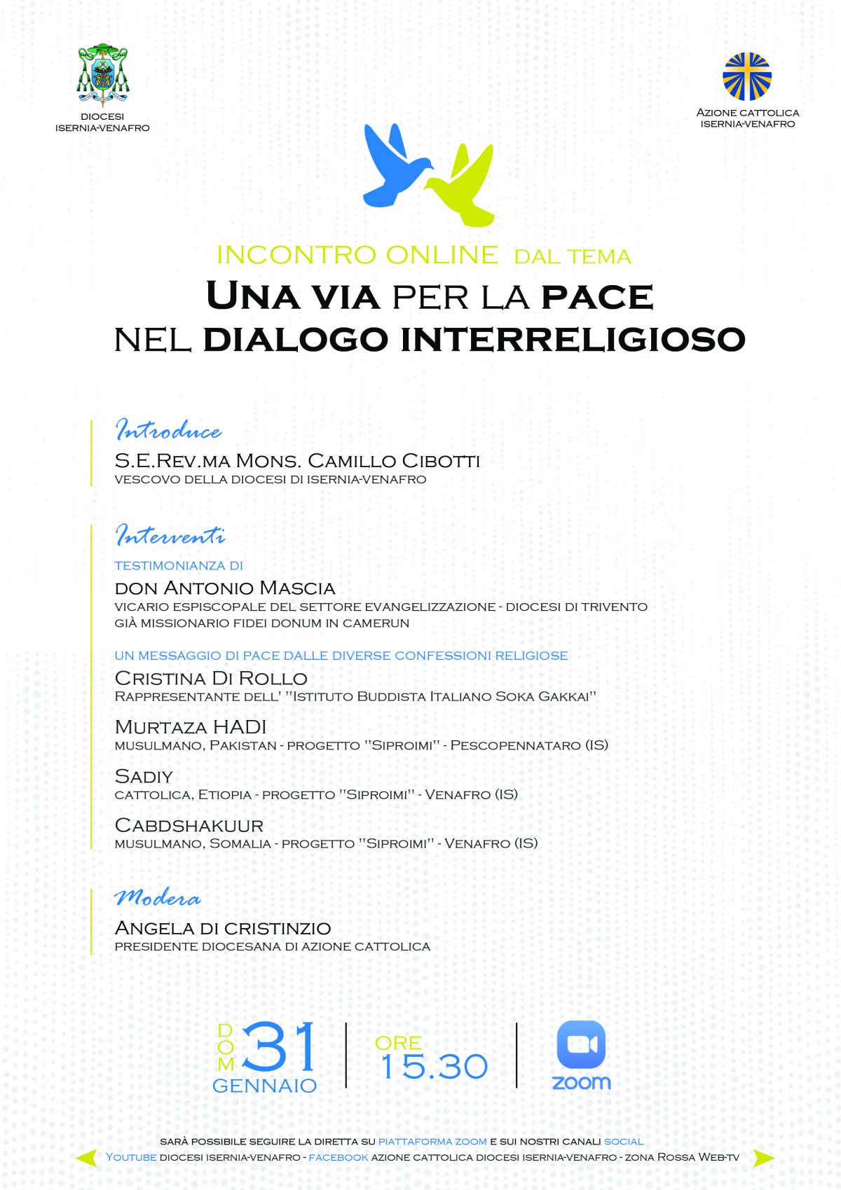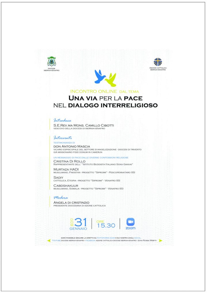 Un incontro online, promosso insieme alla Diocesi di Isernia-Venafro, dal tema UNA VIA PER LA PACE NEL DIALOGO INTERRELIGIOSO. Aprirà l’incontro il vescovo della Diocesi di Isernia-Venafro, S.E. Rev.ma Mons.CAMILLO CIBOTTI. Ospite sarà Don ANTONIO MASCIA, sacerdote della Diocesi di Trivento, nonché Vicario Episcopale del settore evangelizzazione e già missionario Fidei Donum in Camerun, che ci racconterà la sua preziosa testimonianza vissuta in terra di missione. Le diverse confessioni religiose, attraverso i loro rappresentanti, condivideranno un messaggio di pace. Nello specifico, saranno presenti CRISTINA DI ROLLO – rappresentante dell’Istituto Buddista Italiano Soka Gakkai – MURTAZA HADI – musulmano del Pakistan del progetto Siproimi di Pescocostanzo (Is) – SADIY, Cattolica dell ‘Etiopia e CABDSHAKUR, musulmano, entrambi del progetto Siproimi di Venafro (Is). Sarà moderatrice ANGELA DI CRISTINZIO, presidente diocesana dell’Azione Cattolica di Isernia-Venafro. Sarà possibile seguire la diretta, oltre che su piattafroma zoom, anche sulle nostre pagine social: Facebook [Azione Cattolica Diocesi Isernia-Venafro] e YouTube [Diocesi Isernia-Venafro]