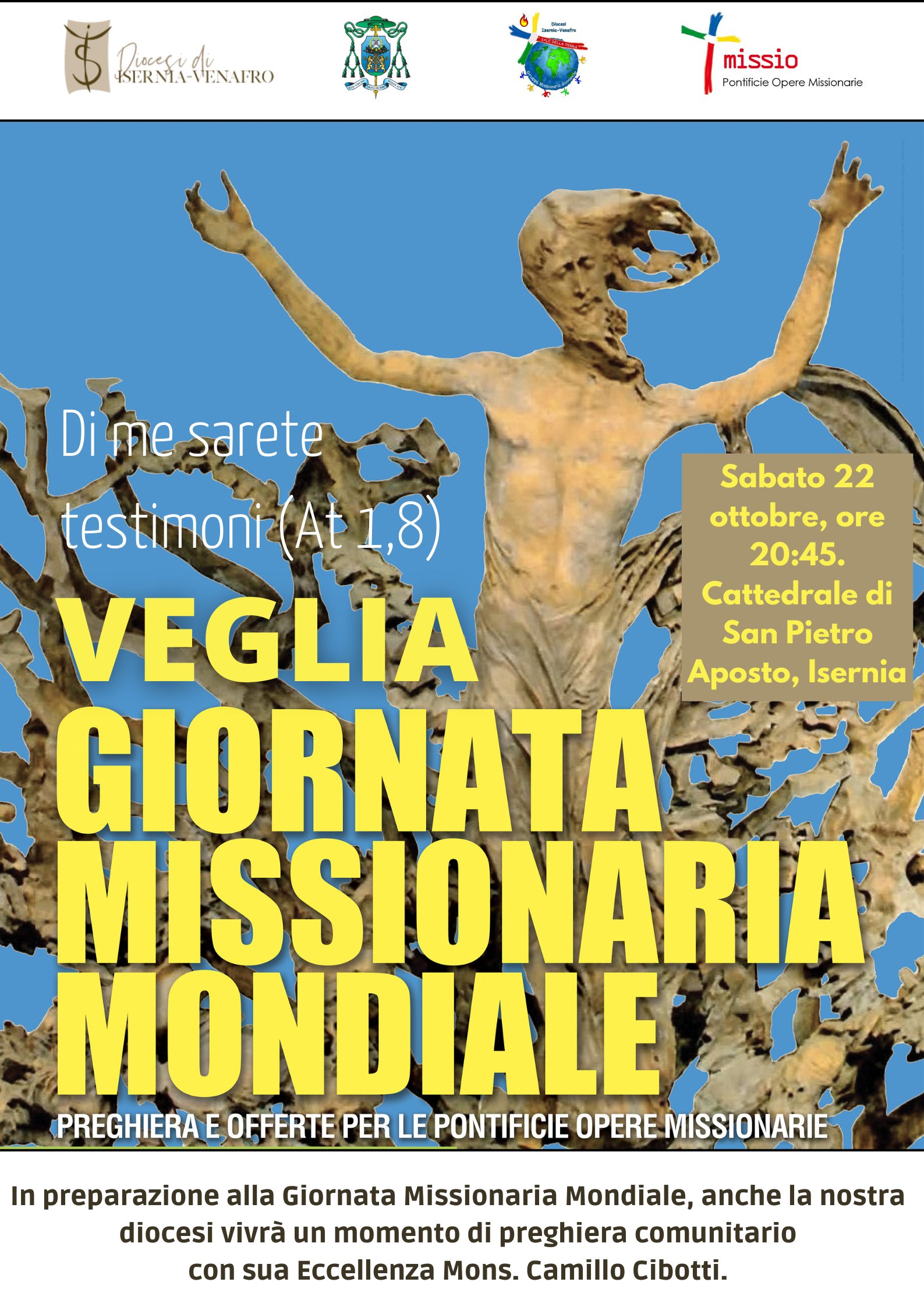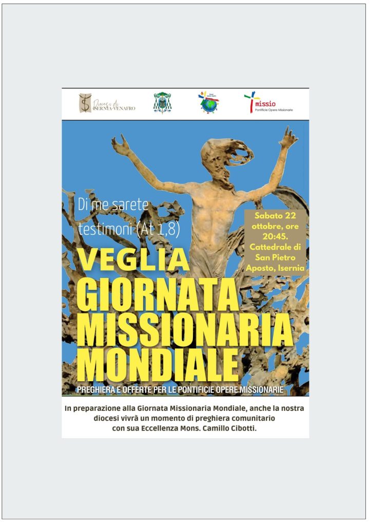 Anche la nostra diocesi, in preparazione a questo importante evento mondiale, ha deciso di riunirsi in una veglia di preghiera, presieduta da Sua Eccellenza Mons. Camillo Cibotti, il giorno sabato 22 ottobre, ore 20:45, presso la cattedrale San Pietro Apostolo in Isernia.